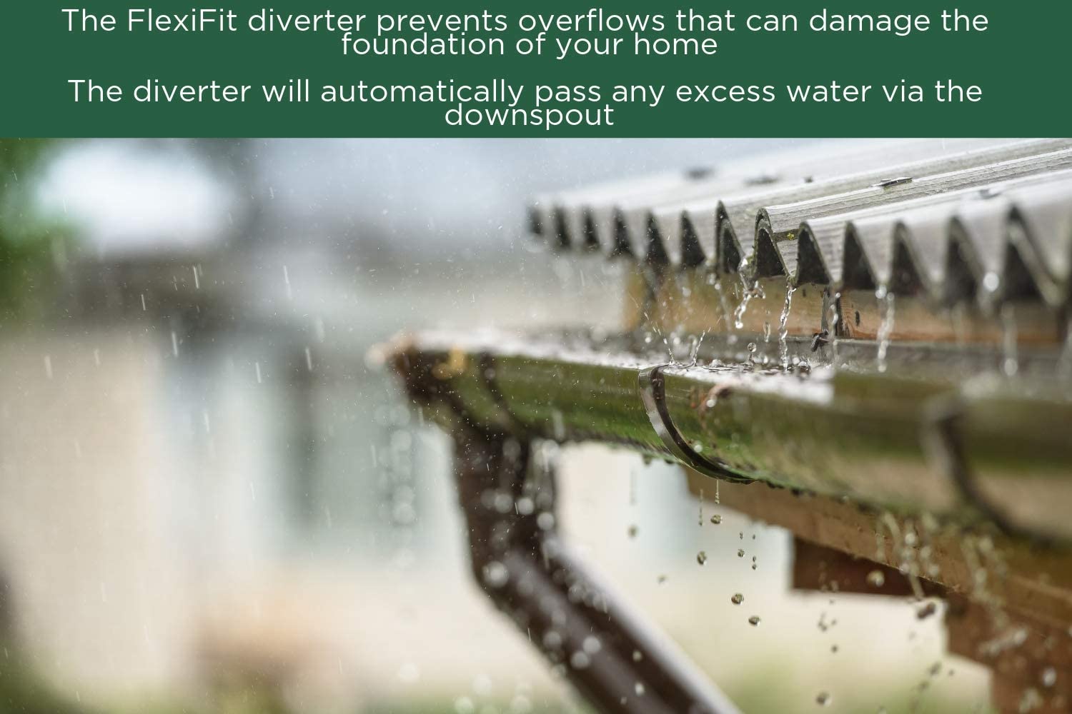 - PATENTED TECHNOLOGY - FlexiFit diverter prevents overflows that can damage the foundation of your home; the diverter will automatically pass any excess water via the downspout