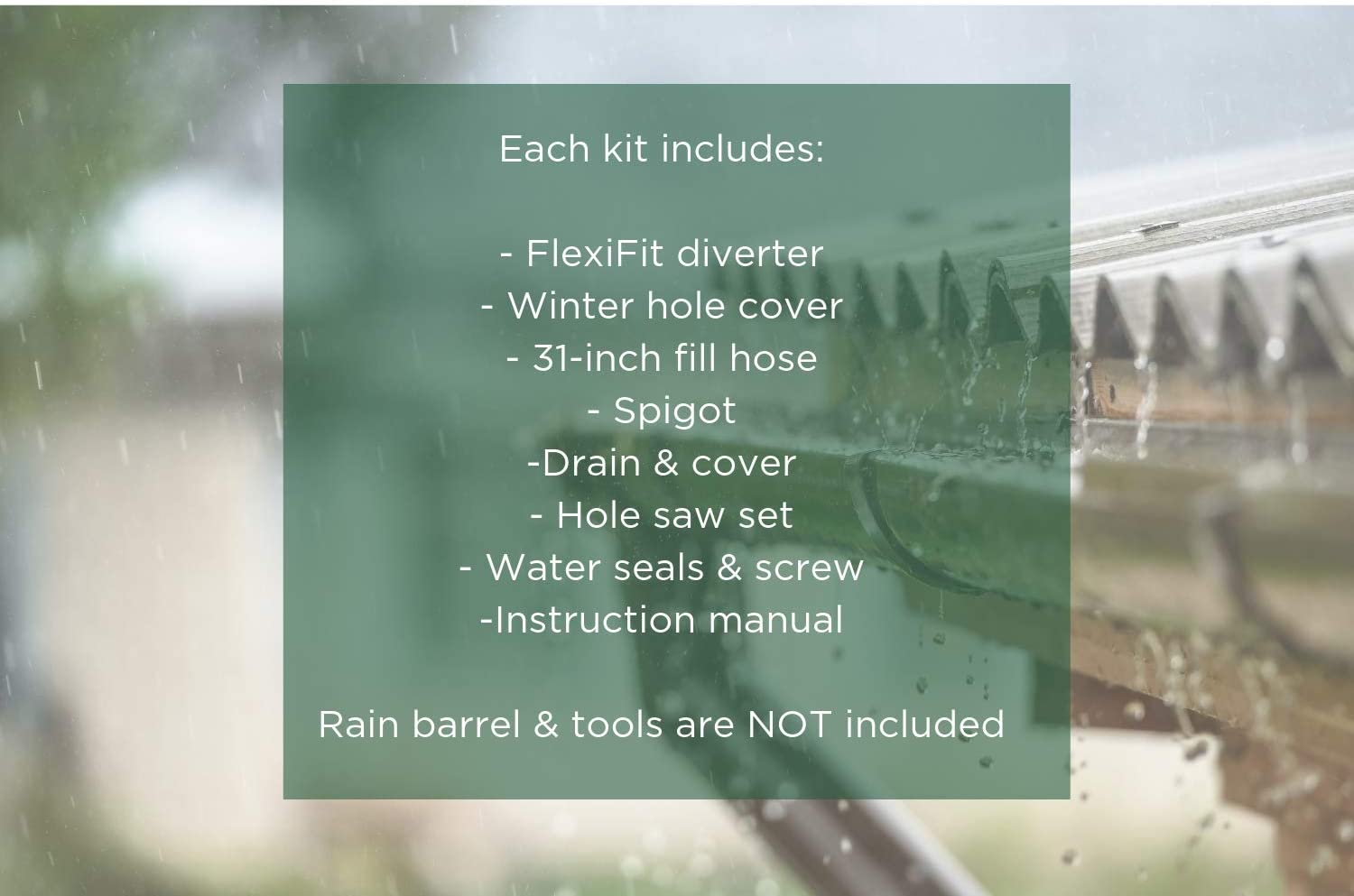 - ALL PARTS INCLUDED - FlexiFit diverter, winter hole cover, 31-inch fill hose, spigot, drain and cover, hole saw set, water seals and screw, instruction manual; rain barrel and tools are NOT included