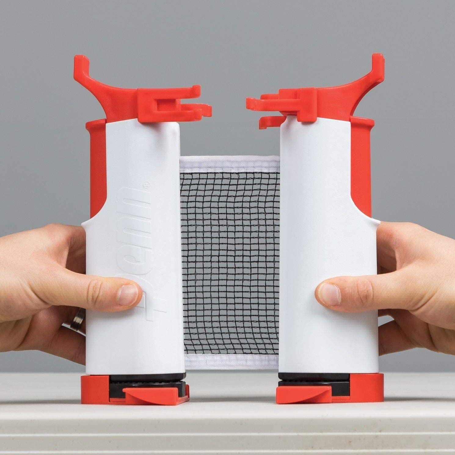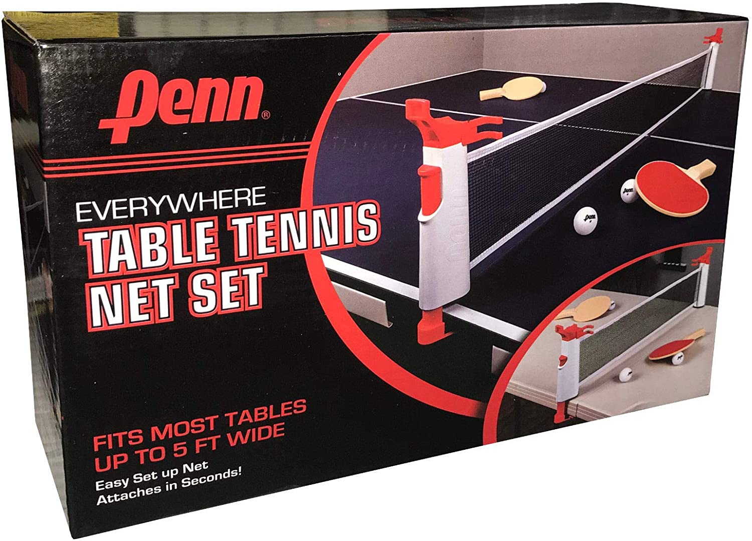 Table tennis just got a lot more convenient with the Penn Everywhere Table Tennis Net Set! This portable game set lets you take your table tennis on the go and fits any table up to 5 feet wide. The retractable net system expands or shortens to give you the best possible fit. The included molded, all-weather paddles and balls are easily stowed in the integrated storage system that makes this game set incredibly simple to transport. You can play almost anywhere at anytime! All you need is a table! It's perfect for camping, parties, and barbecues and set up is fast and easy. There's a reason why it's called the Penn Everywhere Table Tennis Net Set! Set includes: 1 retractable net system, 2 all-weather paddles, 3 ping pong balls. Available Size: 1 SET: RETRACTABLE NET, 2 ALL WEATHER PADDLES, 3 BALLS.