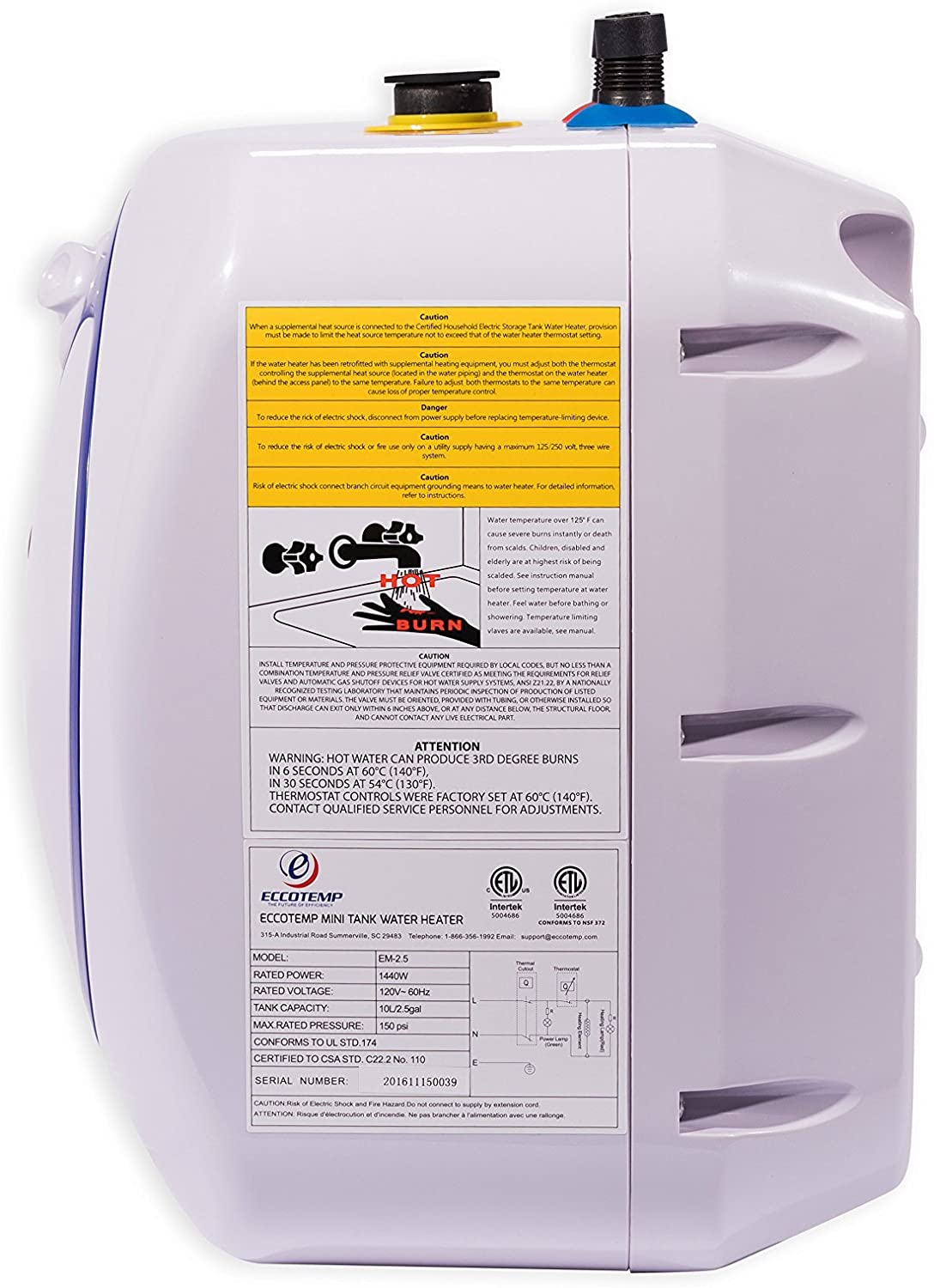 The Eccotemp EM-2.5 is a point of use Mini-Tank Water Heater with a tank capacity of 2.5 gallons and is designed to supply on-demand hot water to any faucet without the wait. It's small, compact and lightweight design allows the Eccotemp EM-2.5 to be perfect for residential, commercial and industrial use. The Eccotemp EM-2.5 Mini-Tank Water Heater can supply hot water for up to two sinks or can be plumbed in series with your existing hot water system to ensure instant hot water whenever you need it. Equipped with easy and accessible temperature controls and a minimal recovery time of 20 minutes, this Eccotemp Mini-Tank Water Heater is designed to operate at a maximum of 150 psi water pressure. Easy installation allows for the unit to be mounted on a wall or left free-standing and plugs into a standard 110/120v outlet.