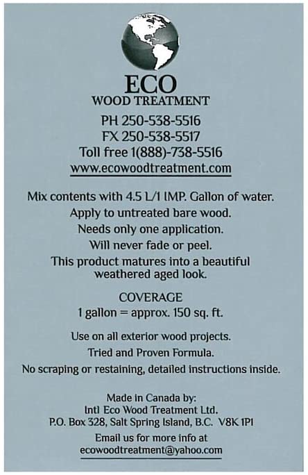 Non-toxic Eco Wood Treatment ages wood to a silvery pantina color and creates a high end look with just one application - no need to restain. Will not wear off, fade, or peel. Migrates and covers exposed wood as cracking occurs. Eco powder is composed of natural substances from minerals leaving no harmful residue in water or soil. Recommended for use on: decks, fences, siding, picnic tables, outdoor furniture, flower pots, marinas, wood street signs, birdhouses, gazebos, windows, doors, and more. Mix powder with water and apply with brush, sprayer, or roller directly onto the wood surface. Tintable. Interior/exterior use. Soap and water cleanup.