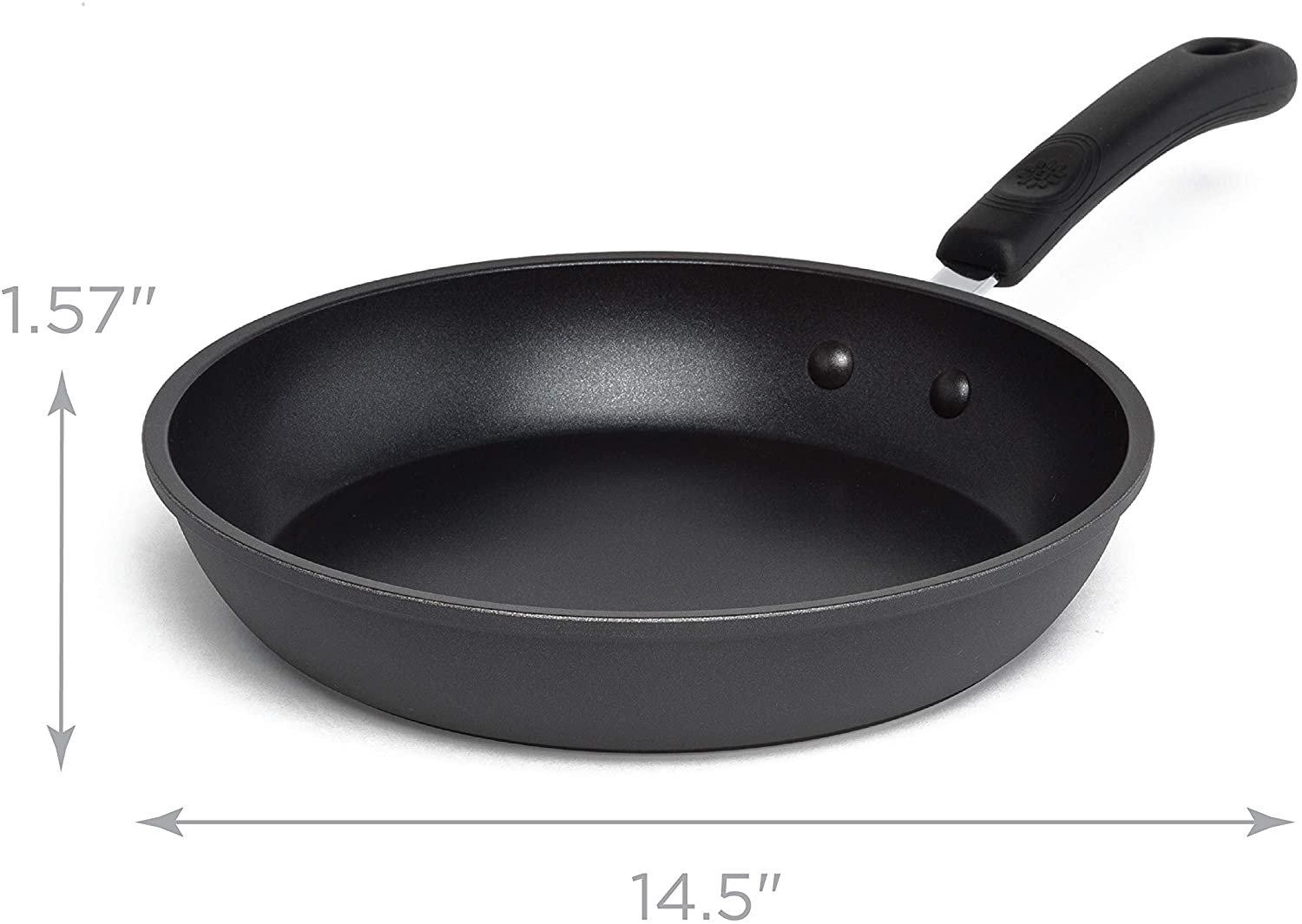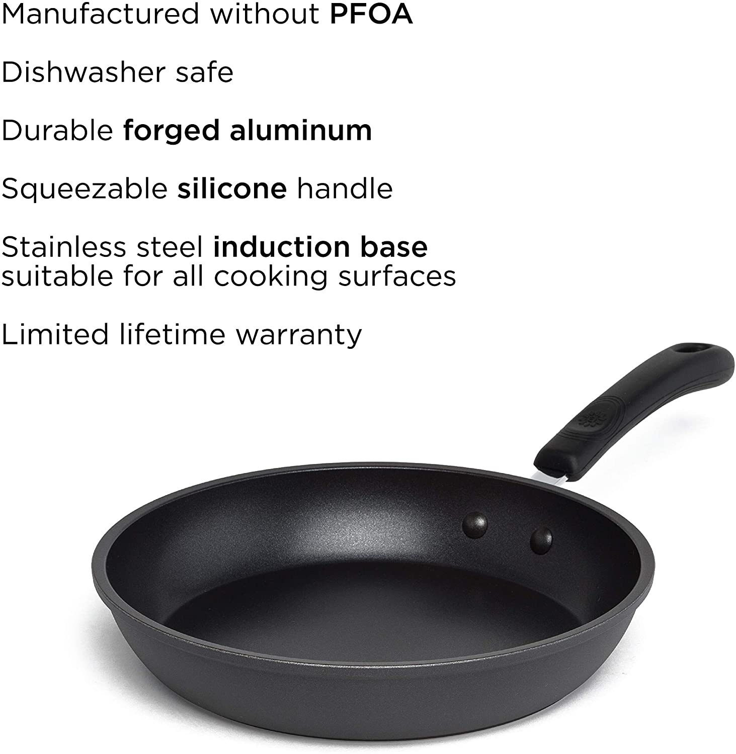 Ecolution Symphony 9.5" Fry Pan features Hydrolon - PFOA free nonstick which results in fewer greenhouse gases, Hydrolon is water based. We replaced nasty PFOA solvents with water. When the non-stick is applied to the pan water solvent evaporates rather then emitting PFOA into the air. Eco is part of our name and our products. If you share a genuine concern for the planet, we have something in common. We believe that cooking well in the kitchen and doing good for the planet can happen at the same time. Our cookware uses manufacturing techniques that do not include the use of PFOA toxins. Ecolution aims to educate the public on how to recycle old cookware.