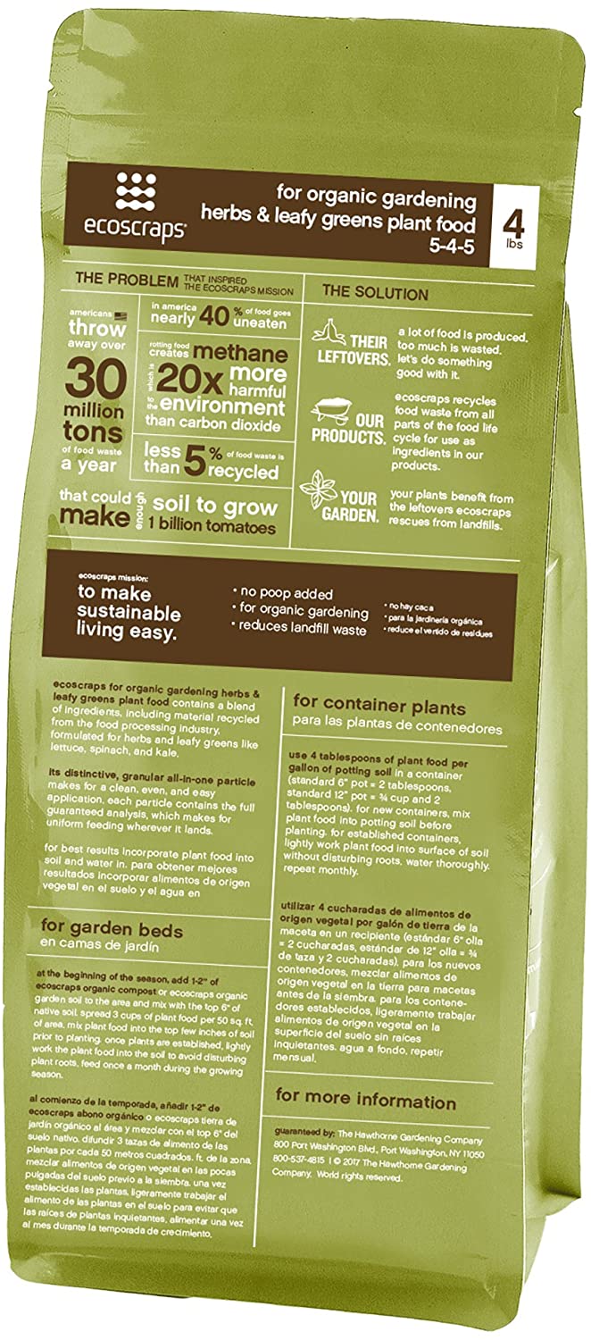 Ecoscraps for Organic Gardening Herbs & Leafy Greens Plant Food contains a blend of ingredients, including material recycled from the food processing industry. Formulated specially for the growing needs of herbs and leafy greens like lettuce, spinach, and kale. Its distinctive all-in-one particle makes for a clean, even, and easy application. Each particle contains the full guaranteed analysis, which makes for uniform feeding wherever it lands.
