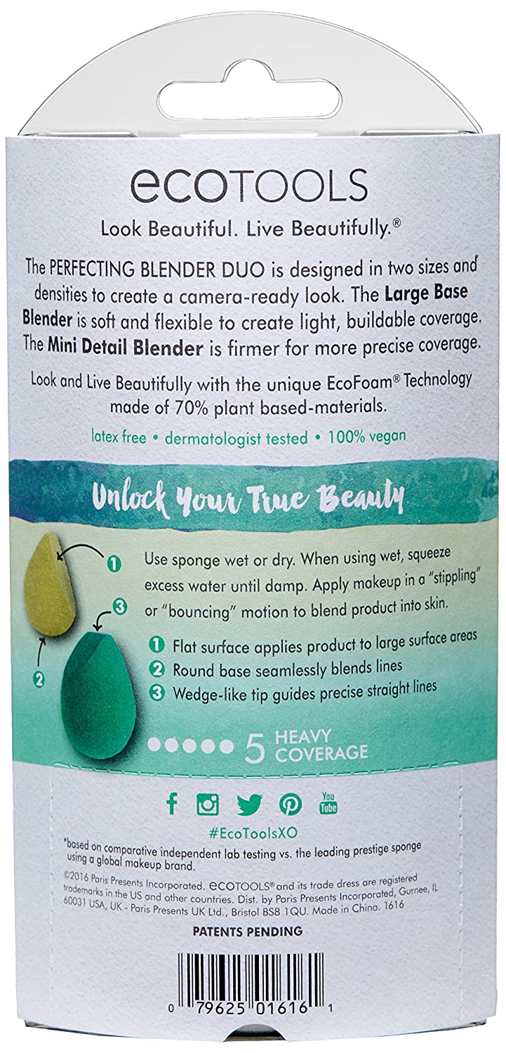 The Perfecting Blender Duo is designed with EcoFoam Technology in two sizes and densities to create a camera ready look. The Large Base Blender is soft and flexible to create light, buildable makeup application. The Mini Detail Blender is firmer for more precise and detailed coverage. We've always believed in the power of beauty. At EcoTools we encourage you to embrace your own individual meaning of beauty and share it with the world, whether it is makeup tutorials, an inspirational story or giving back to the community. Because when you feel truly beautiful, you will make the world and everyone around you feel beautiful! Armed with a mission to make women look beautiful on the outside and feel just as good on the inside, sisters Jen and Stacey set out to create a brush collection that was not only nature friendly, but chic, high-quality, and affordable too. After sourcing recycled materials, renewable bamboo and better manufacturing processes, in 2007, EcoTools was born. This year, we’re celebrating EcoTools’ 10th anniversary by introducing a fresh new look, brushes that feel even better in your hands, and packaging with detailed tutorials that make it easier than ever to create a beautiful look from hair to toe. We’re also marking a decade of living beautifully by making a $100,000 donation to Glamour’s The Girl Project via our #MyTrueBeauty campaign that supports women’s empowerment and encourages women to become the best version of themselves. We believe in giving a new purpose to old things. That’s why our products are made from recycled aluminum and plastic. Our packaging is made of 100% Tree-Free paper. HOW? With 20% cotton and 80% bamboo fibers! The handles on our products are made of renewable bamboo, one of the fastest growing plants on the planet!