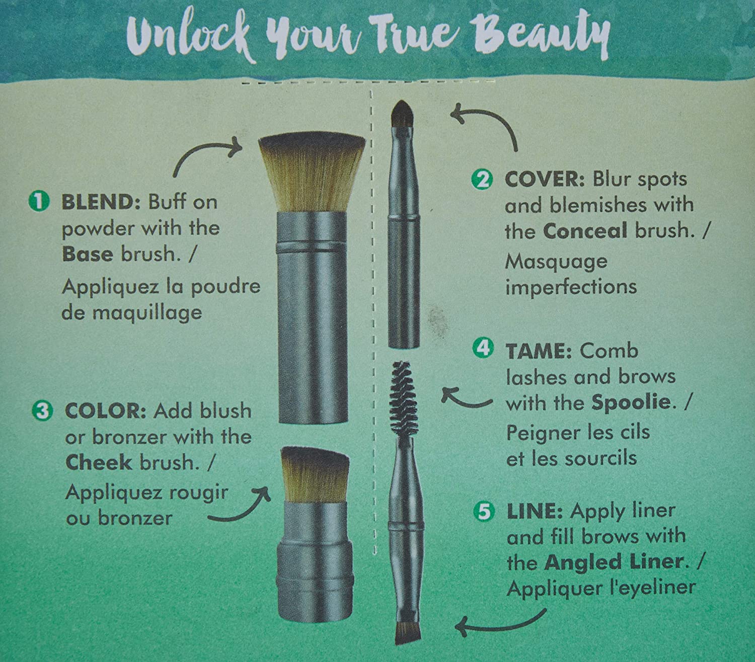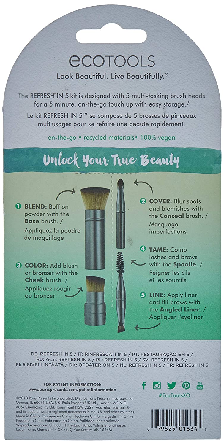 This set is designed with 5 multi-tasking brush heads for a 5-minute touchup for Base, Cheek, Conceal, Spoolie, Angled Liner & 5 brush caps.