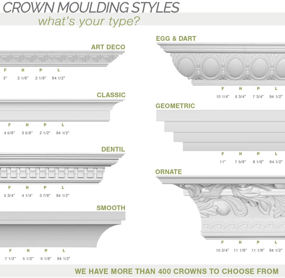 Beautiful crown molding is a great way to separate and define each room. With each design modeled after traditional plaster type moldings, our lightweight polyurethane moldings give the same rich detail, yet at a fraction of the cost. Most molding profiles can be partnered with our do-it-yourself corner blocks that means no miter cutting for you and most rooms can be completed in ours instead of days. Another benefit of polyurethane is it will not rot or crack and is impervious to insect manifestations. It comes to you factory primed and ready for your paint, faux finish, gel stain, marbleizing and more.