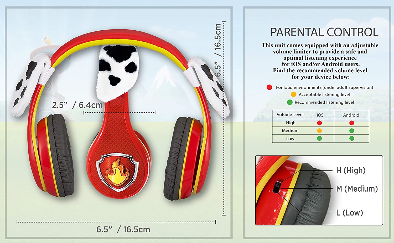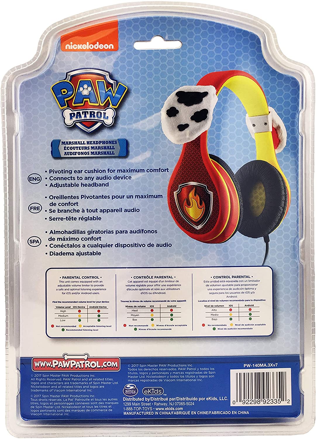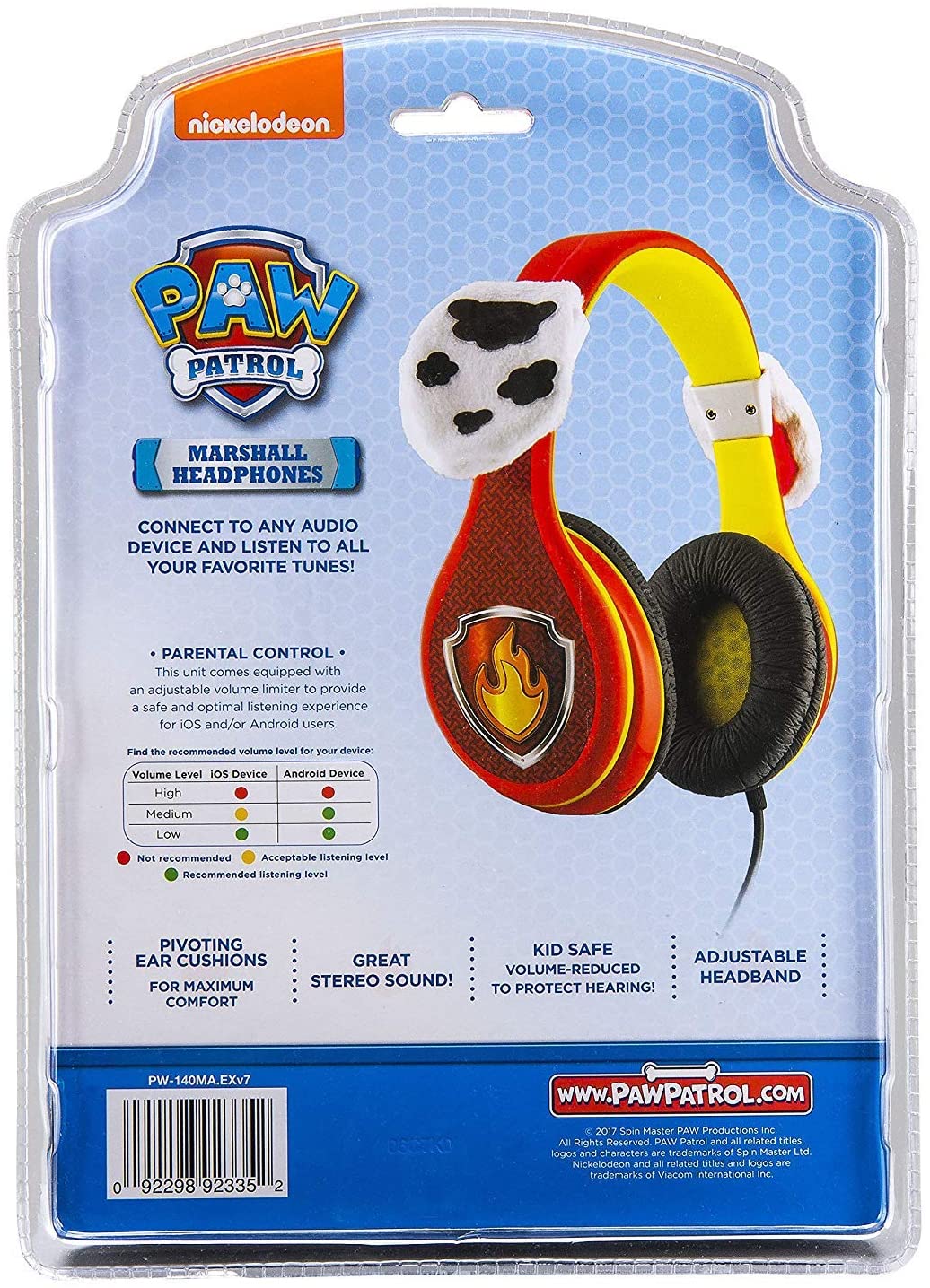 The new Paw Patrol kid friendly headphones with cute ears are here! ! Listen to whatever you like in safety, comfort, and style. These high quality headphones are equipped with a volume limiting switch to ensure safe sound levels for kids. The cute Paw Patrol graphics are perfect for your little one. Plug in your audio device and listen to anything you want. The pivoting ear cushions and adjustable headband provide comfort and quality so you can enjoy your music for as long as you like. This will make the perfect gift or birthday present for your little one! This unit features; Volume Limiting Switch, Connects to Any Audio Device, Adjustable Headband, Pivoting Ear Cushions, Paw Patrol graphics. Order Now! !