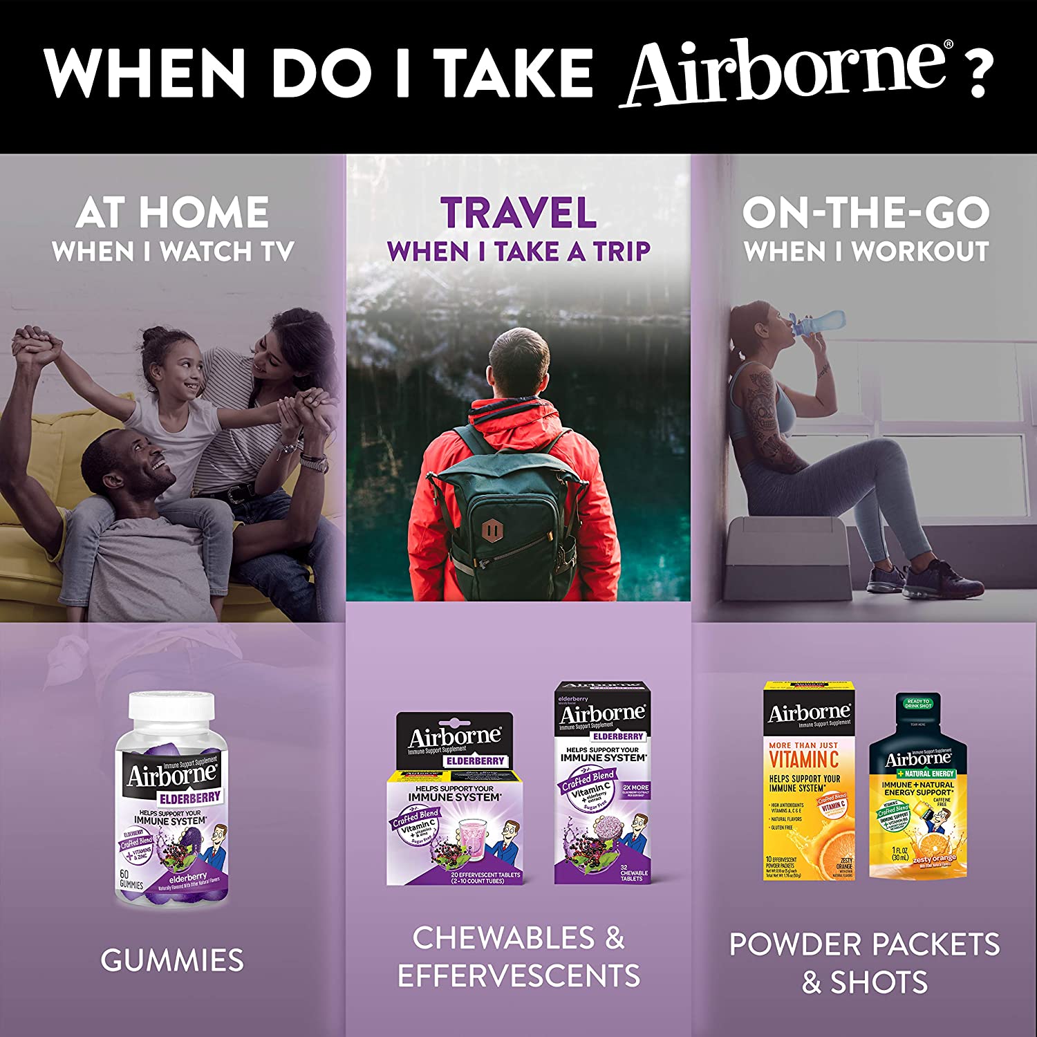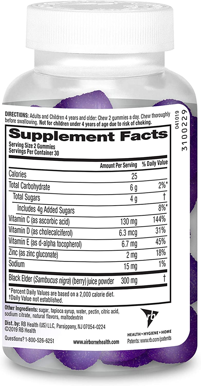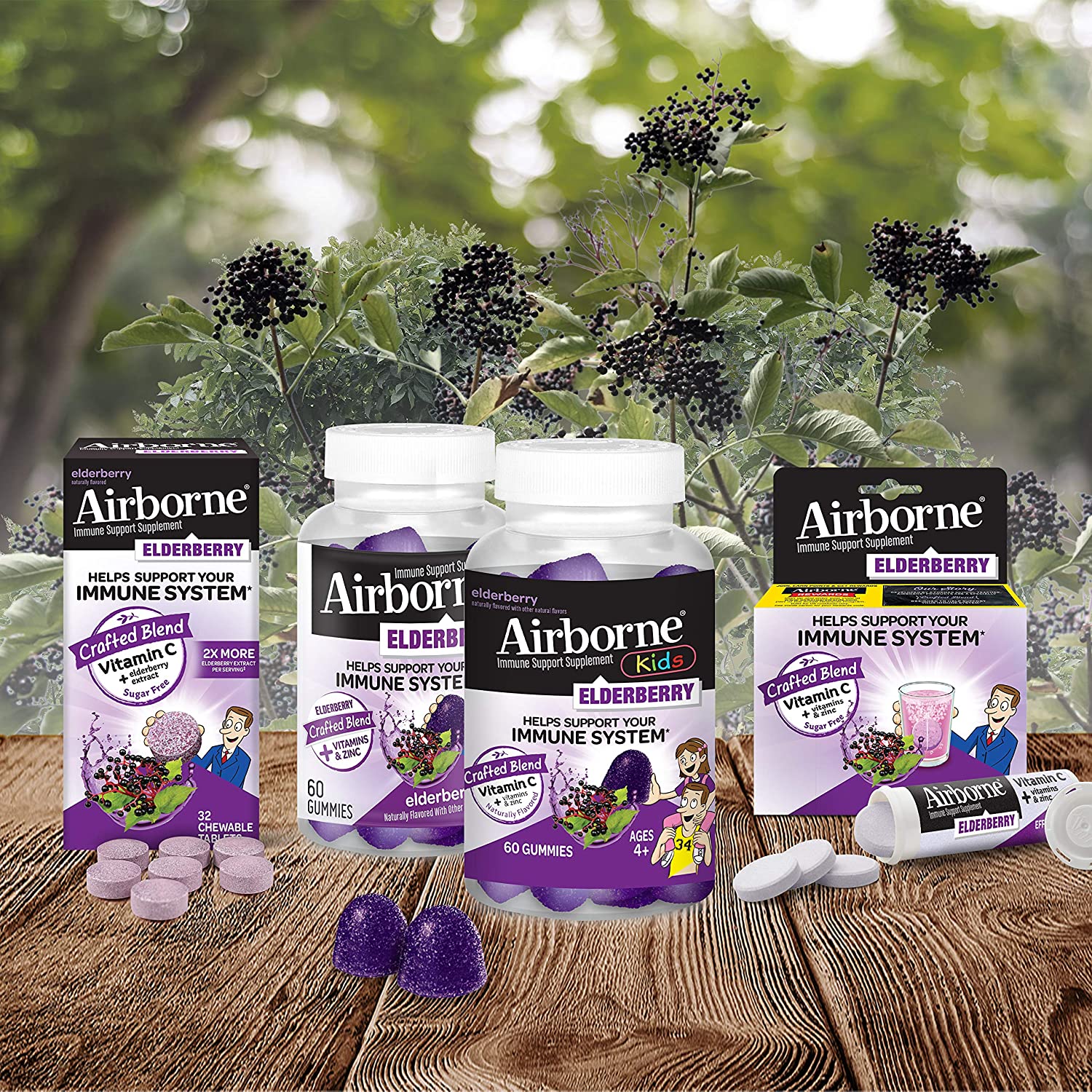 All NEW from Airborne comes Airborne Elderberry Gummies (with Vitamins C, D, E & Zinc). This immune support supplement is blended to help support your immune system٭. Various parts of the elderberry tree have been used for culinary, as well as medicinal purposes, for thousands of years.٭ This supplement is Gluten Free, Gelatin Free, has NO Artificial Sweeteners and NO Color Added. It is naturally flavored, is high in antioxidants (Vitamins C & E), is an excellent source of Vitamin D and contains Zinc. What is Airborne? Developed by a former school teacher, Airborne products are a specially crafted blend of vitamins, minerals & herbs designed to help support your immune system٭. ٭These statements have not been evaluated by the Food and Drug Administration. This product is not intended to diagnose, treat, cure or prevent any disease.