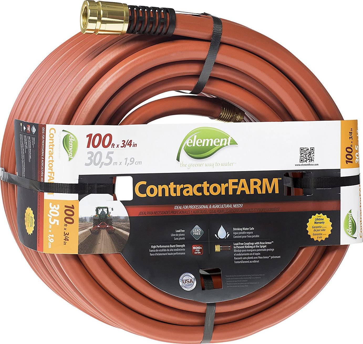 The Element Lead-Free, Drinking Water Safe Contractor Farm Hose is a water hose ideal for farm or construction sites, designed to withstand daily wear and tear from demanding work. This farm hose features extra-large crush-proof coupling and hose armor that prevents kinking at the spigot, allowing you to rely on the hose to last through many years of use around heavy equipment and machinery without being damaged. Equipped to handle tough jobs, the farm hose has a powerful bust strength of 600 PSI for high intensity water applications; features reinforcements at key stress points to ensure many years of reliability. Hose is completely lead-free and meets the lead-free standard under the Safe Drinking Water Act, as well as California's strict standards on phthalate content; allowing you to use the hose to water vegetables, fruits, grains, and livestock safely without added chemicals.