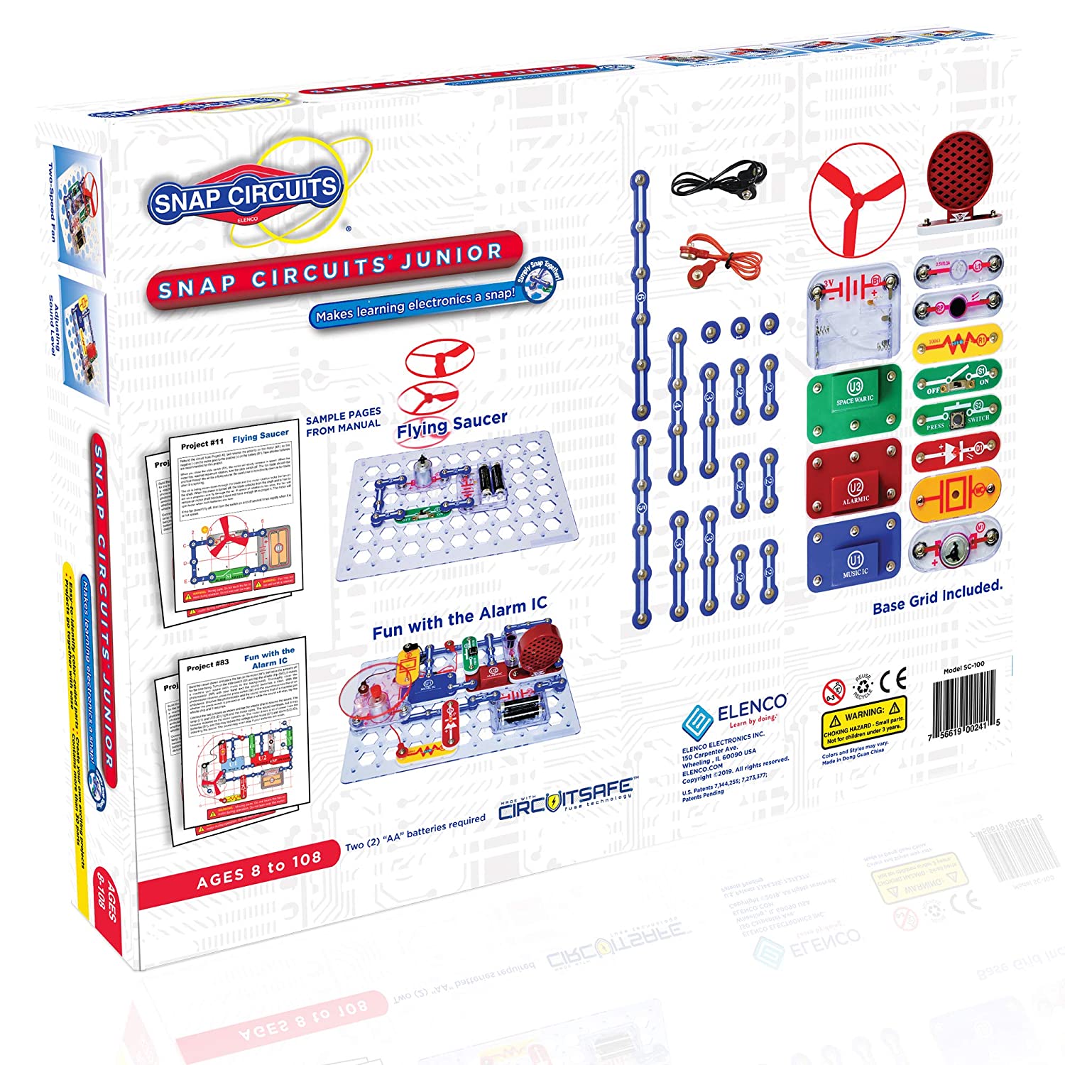 Create Working Electronic Circuits Snap Circuits Jr (SC-100) comes with over 30 components to create 101 different electronic projects. The pieces, which include snap wires, slide switches, an alarm circuit, a music integrated circuit, and a speaker, snap together easily on the included plastic grid--no soldering required. Each piece is numbered and color-coded to make identifying them easy. These components combine to create working circuit boards just like the ones found inside televisions, radios, and other electronic devices. With its easy-to-follow instructions, Snap Circuits gives your child a hands-on education in how electrical circuits work to run the everyday devices that they're familiar with. They'll also gain valuable lessons in building and in following instructions. The project manual includes large color illustrations and simple directions for each project. The projects include a sound-activated switch, a musical doorbell, a voice-controlled lamp, a flying saucer, and a light police siren. With these projects, children will experiment with things like electric switches, integrated circuits, digital circuits, fuses, and the transformation of circuit sounds into other sounds. Includes: Plastic snap-grid, 32 electrical components, and 1 project manual.Recommended for children 8 years and older.