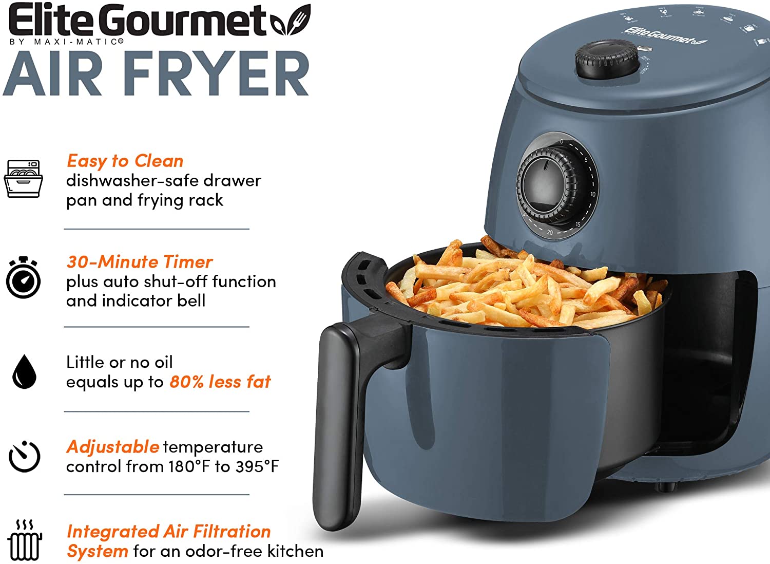 • COOL-TOUCH HANDLE lets you safely remove fried foods from the air fryer without burning your hands. The exterior of the Elite Gourmet air fryer retains its pristine condition with just a damp cloth.