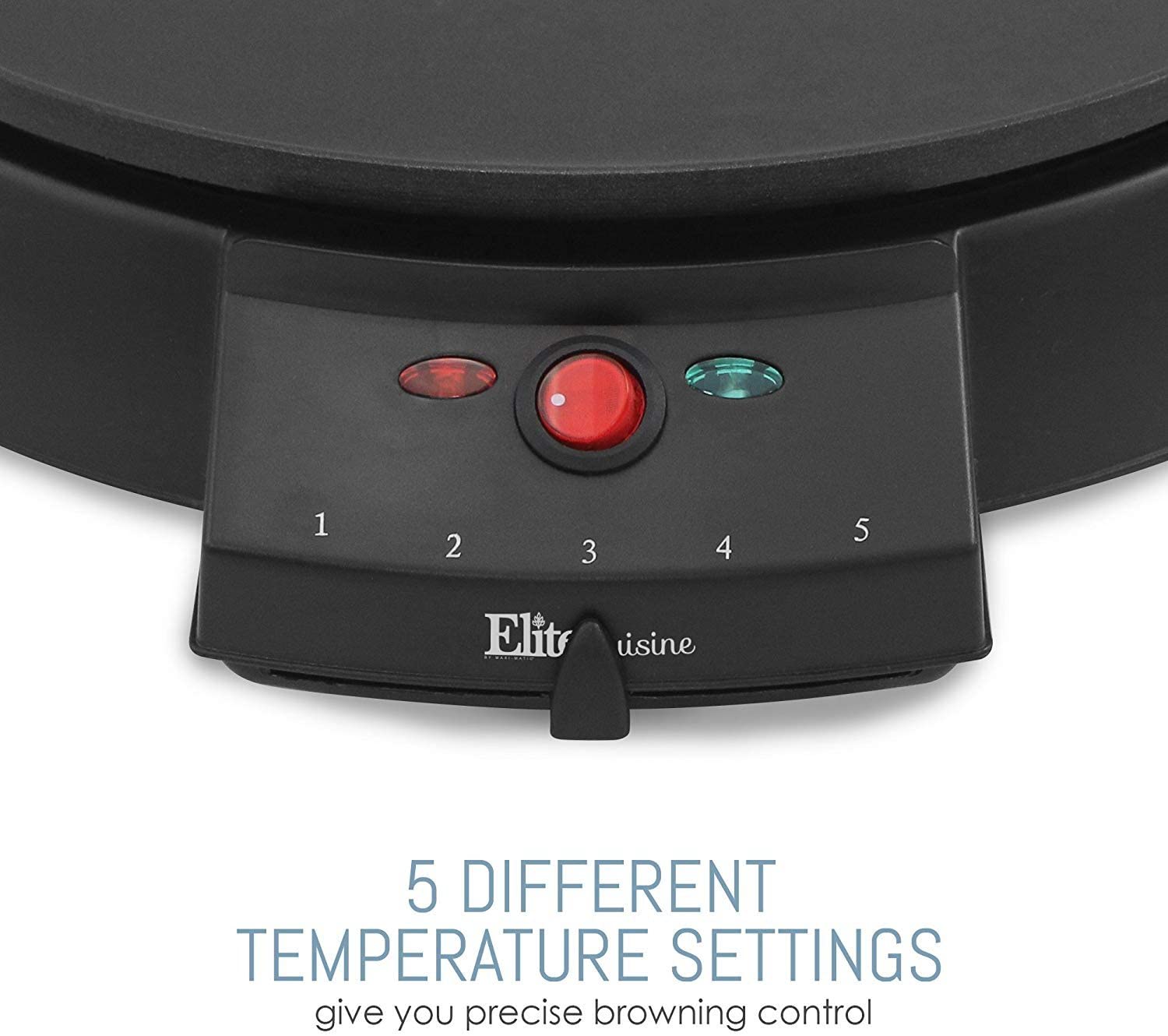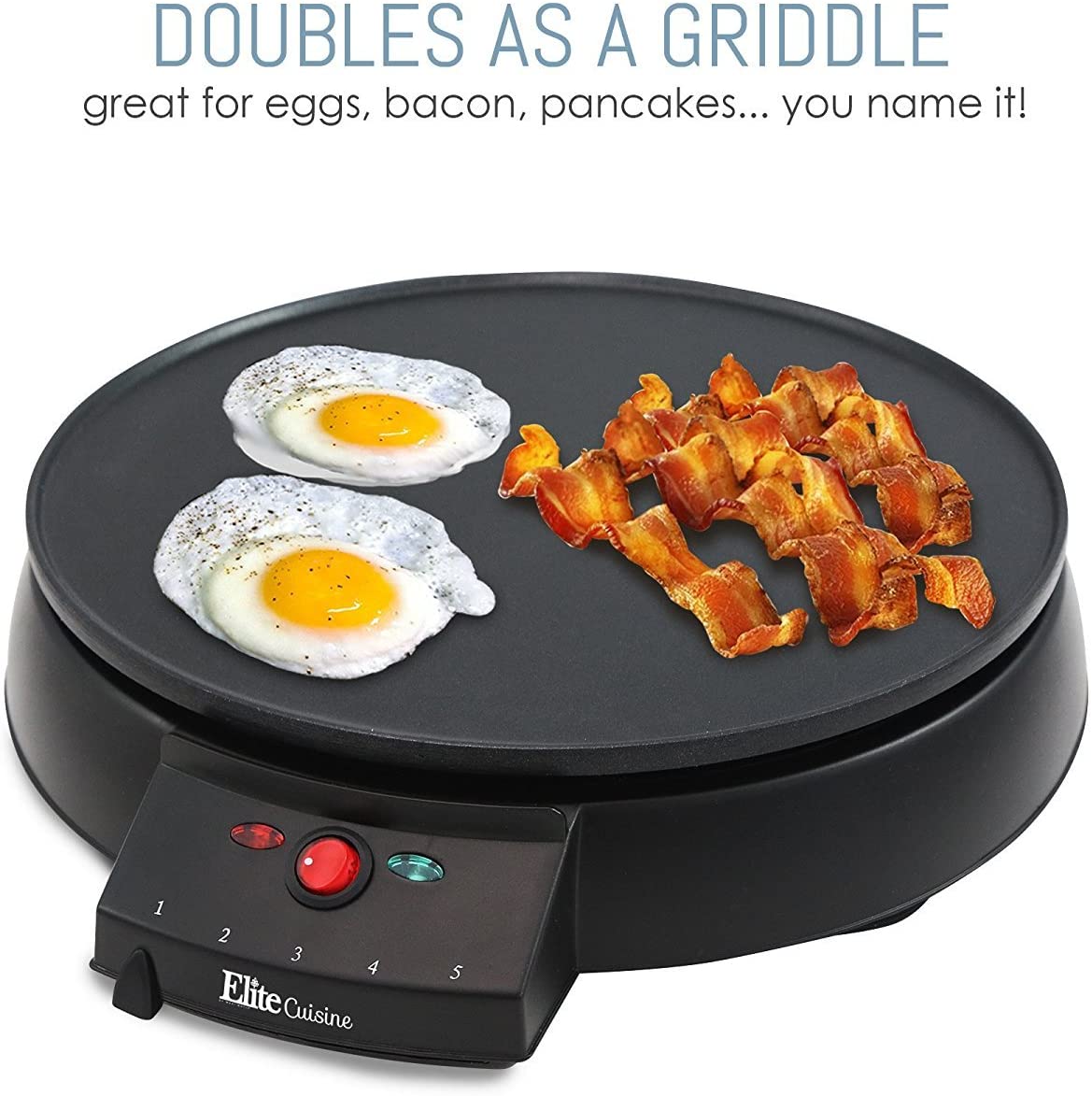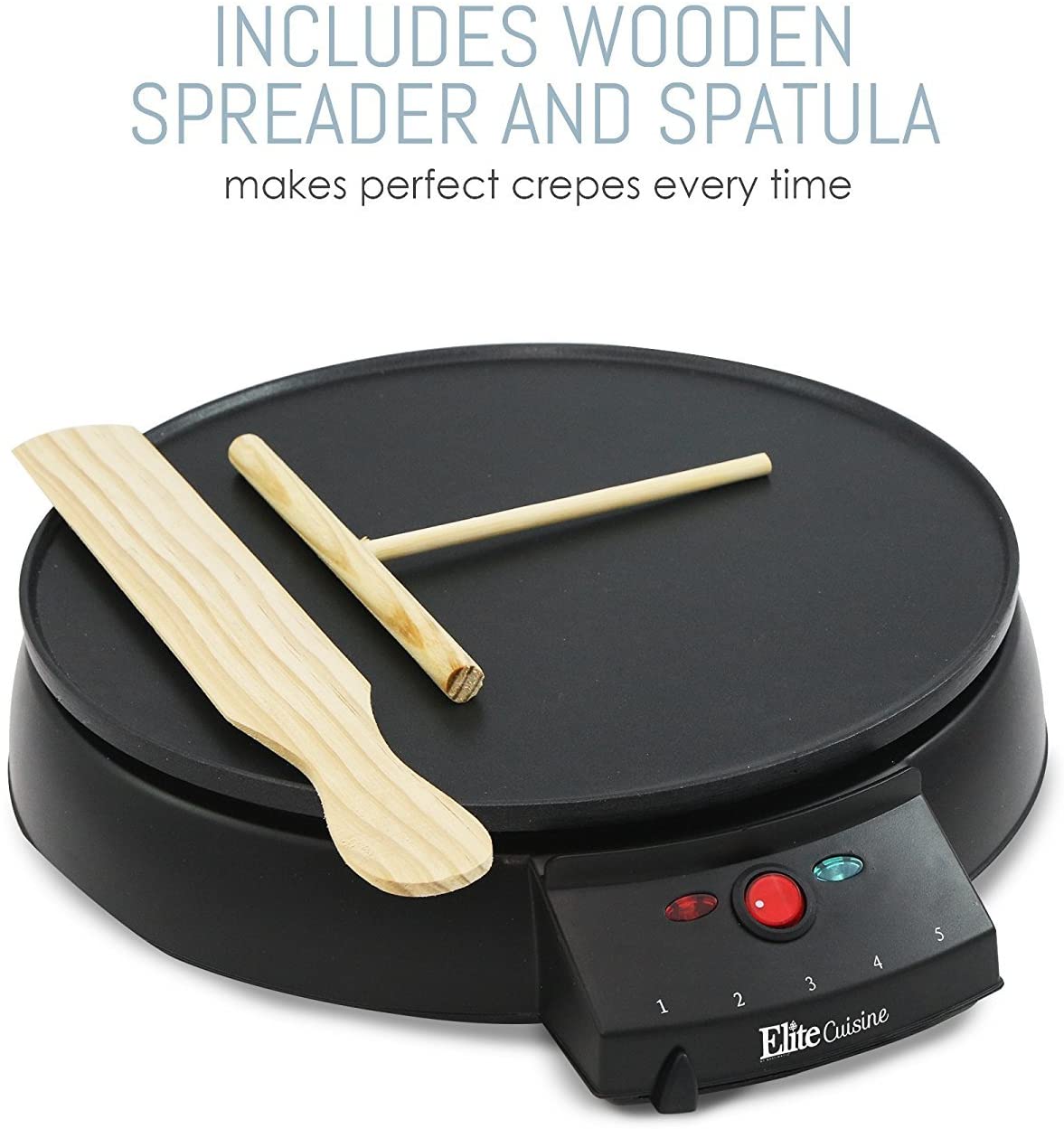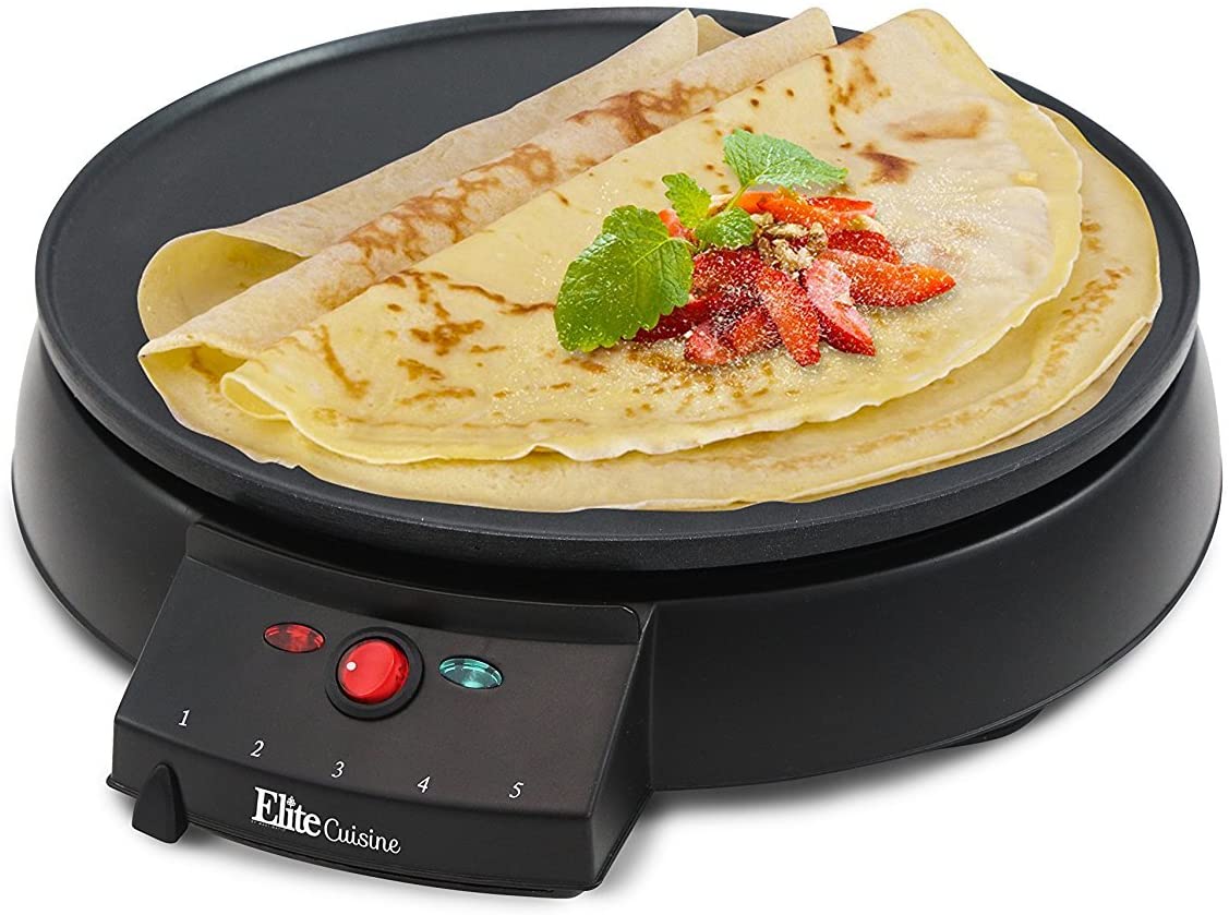 Making crepes is easy and fun with the Elite Cuisine easy Crepe maker! an non-stick 12" griddle plate gives you plenty of room to play! 5 temperature settings and a batter spreader give you the precise control to make perfect crepes. The griddle surface is so versatile it can also be used to prepare a wide variety of breakfast foods such as pancakes, eggs and bacon! includes a recipe book with fun recipes for you to enjoy with friends and/or family. Safety features include an on/off ready light and rubber feet for added stability.