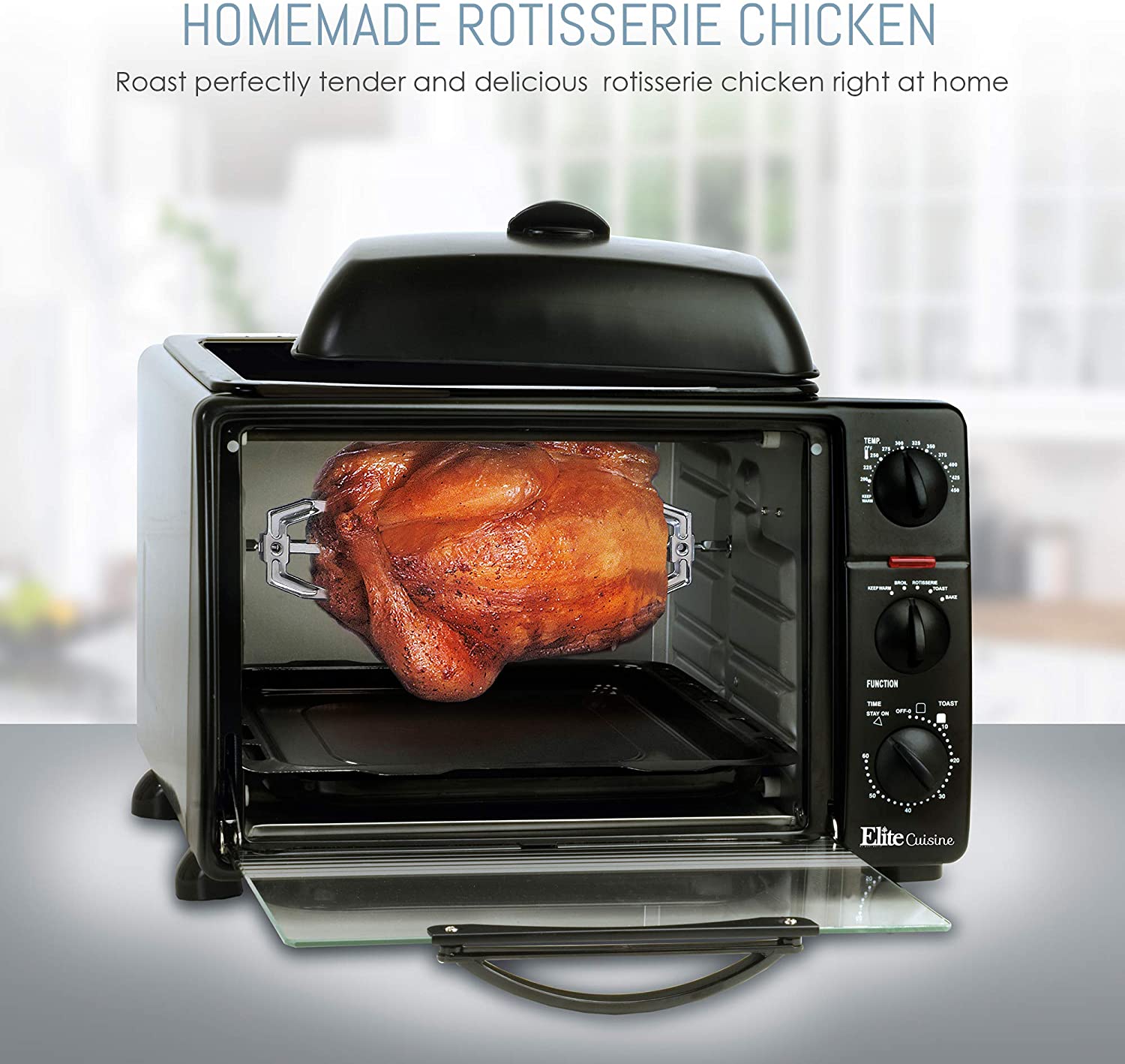 The Elite Cuisine 8-multifunction countertop toaster oven broiler is the perfect all-in-one kitchen appliance. A great addition to any kitchen, It can broil, bake, toast, keep warm and has a rotisserie function. There is even an oven-top nonstick grill, griddle, & steamer with a high-top dome lid to use while cooking in the oven! Its large 23L/6 slice/0. 8CuFt Capacity cooks meals big enough for the whole family and can even bake up to a 12" Pizza! With this many functions in a toaster oven, It was built to make cooking in the kitchen Easy and convenient. With interior dimensions of 11. 75" X 8. 75" X 12" The extra large capacity of this toaster oven is perfect for your big holiday get-togethers or neighborhood parties. Consistent heating up to 450°f and 1500 watts of power make this countertop toaster oven broiler the ultimate powerhouse!