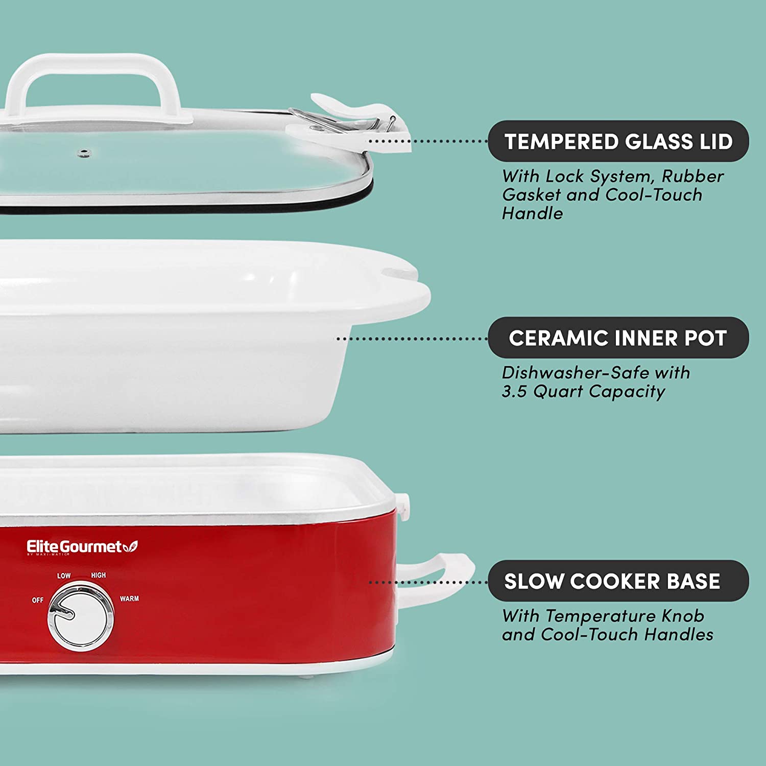 • Prep meals in advance or bring on the go, the Elite Gourmet 3.5Qt. Casserole Slow Cooker makes entertaining a breeze