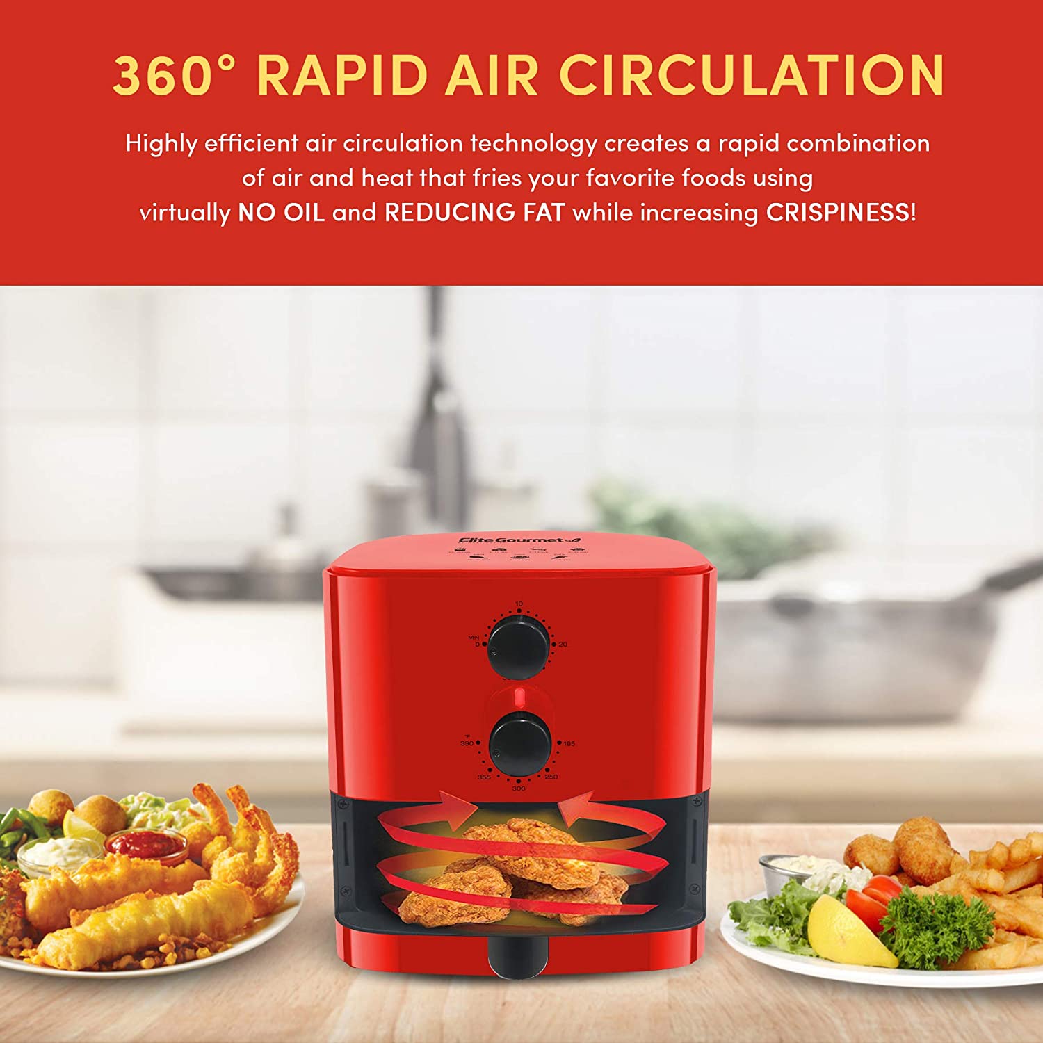 The Elite Gourmet Oil-Free Air Fryer has a variety of functions to handle a wide array of cooking tasks. With its easy to use Timer and Temperature control knobs, you can fry, cook, or even bake your favorite meals and snacks with ease! Not only can you cook foods without the mess of oil but you can cook faster which saves you time and energy. Unlike most conventional deep fryers, the Oil-Free Air Fryer's unique vapor system combined with circulating hot air will automatically make foods crispier and of course healthier without oil.
