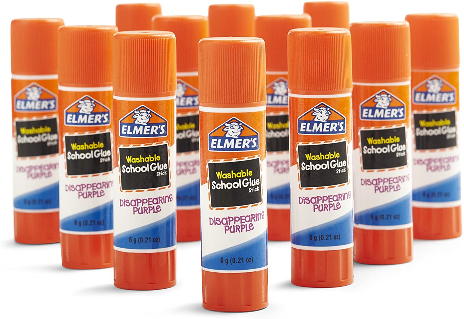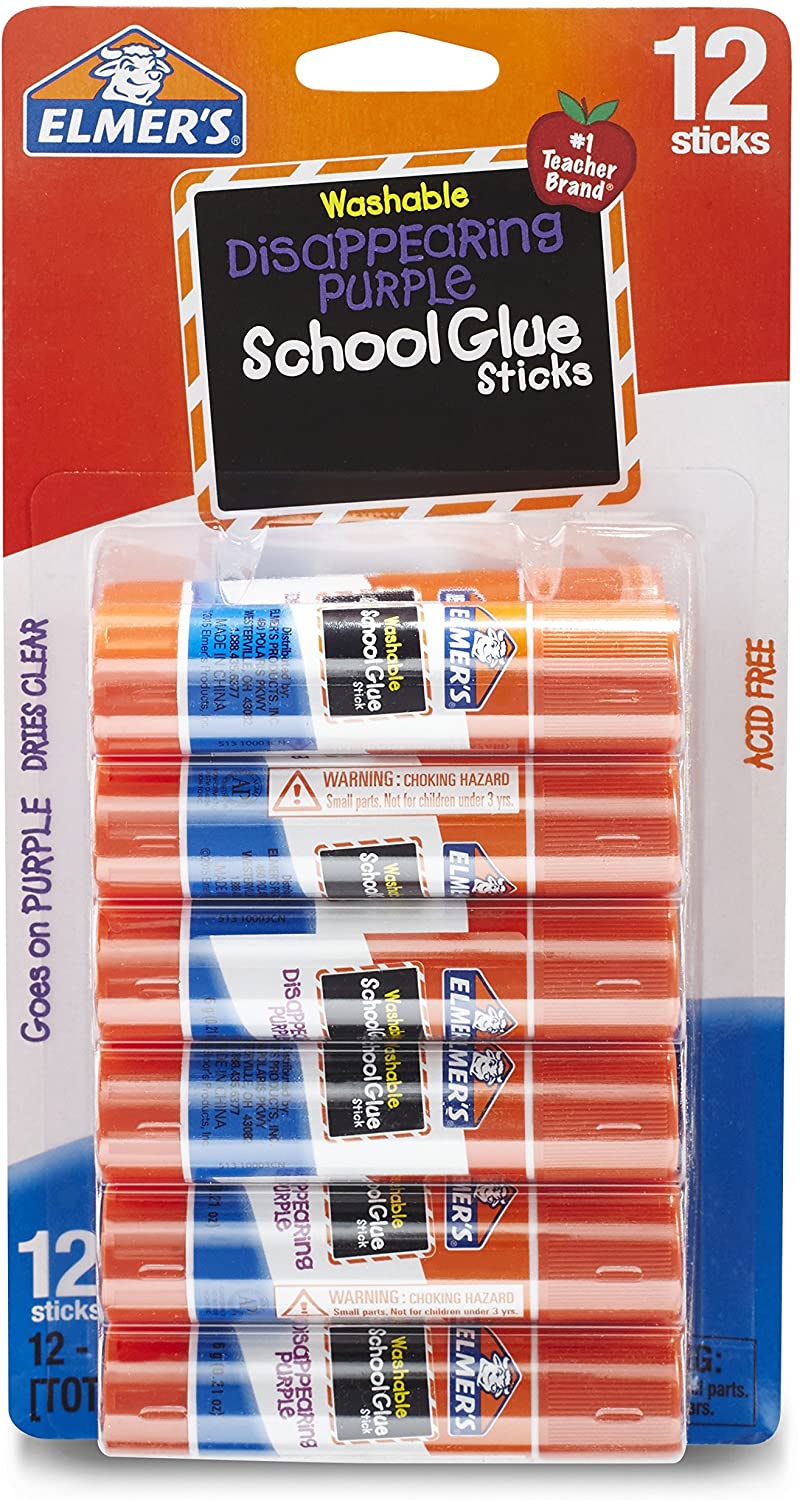 Elmer's Disappearing Purple School Glue Sticks--The Elmer's Disappearing Purple School Glue Stick, available in a classroom-ready pack of 30, goes on smoothly and is great for kids. The Disappearing Purple formula goes on purple, so it is easy to see and dries clear. It is safe, non-toxic, and a must have for all students.