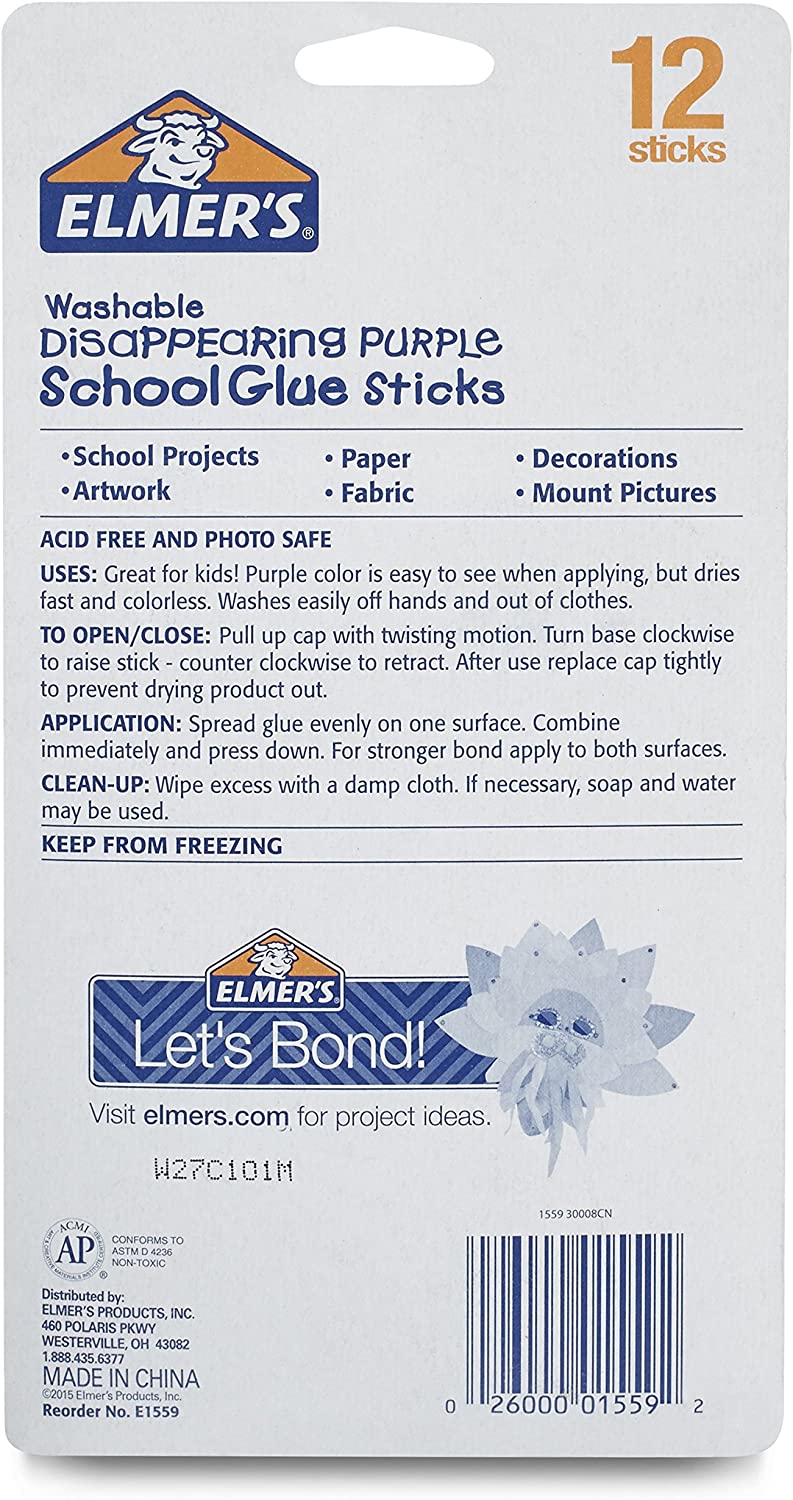 Elmer's Products, Inc. is a company rich in history and tradition. Since the 1940's the Elmer's family of products has developed to meet the ever-changing needs of consumers. They range from a full line of adhesives, arts, crafts, and educational products for children to a complete offering of craft, hobby, office, and home repair products for adults. Elmer's School Glue Sticks are perfect for school projects. Easy to use, easy to clean-up washable glue sticks are the choice for teachers everywhere! This pack comes with 12 Disappearing Purple Glue Sticks. Elmer's Disappearing Purple formula goes on purple and dries clear, so it is easy to see when applying, but dries fast and colorless. Each stick is acid free, photo safe and non-toxic, and washes easily off of hands and out of clothes. You can trust your best work to Elmer's! Through years of growth and innovation Elmer's has proven its longstanding commitment to quality and fulfillment of consumers' inherent need to imagine, build and learn.