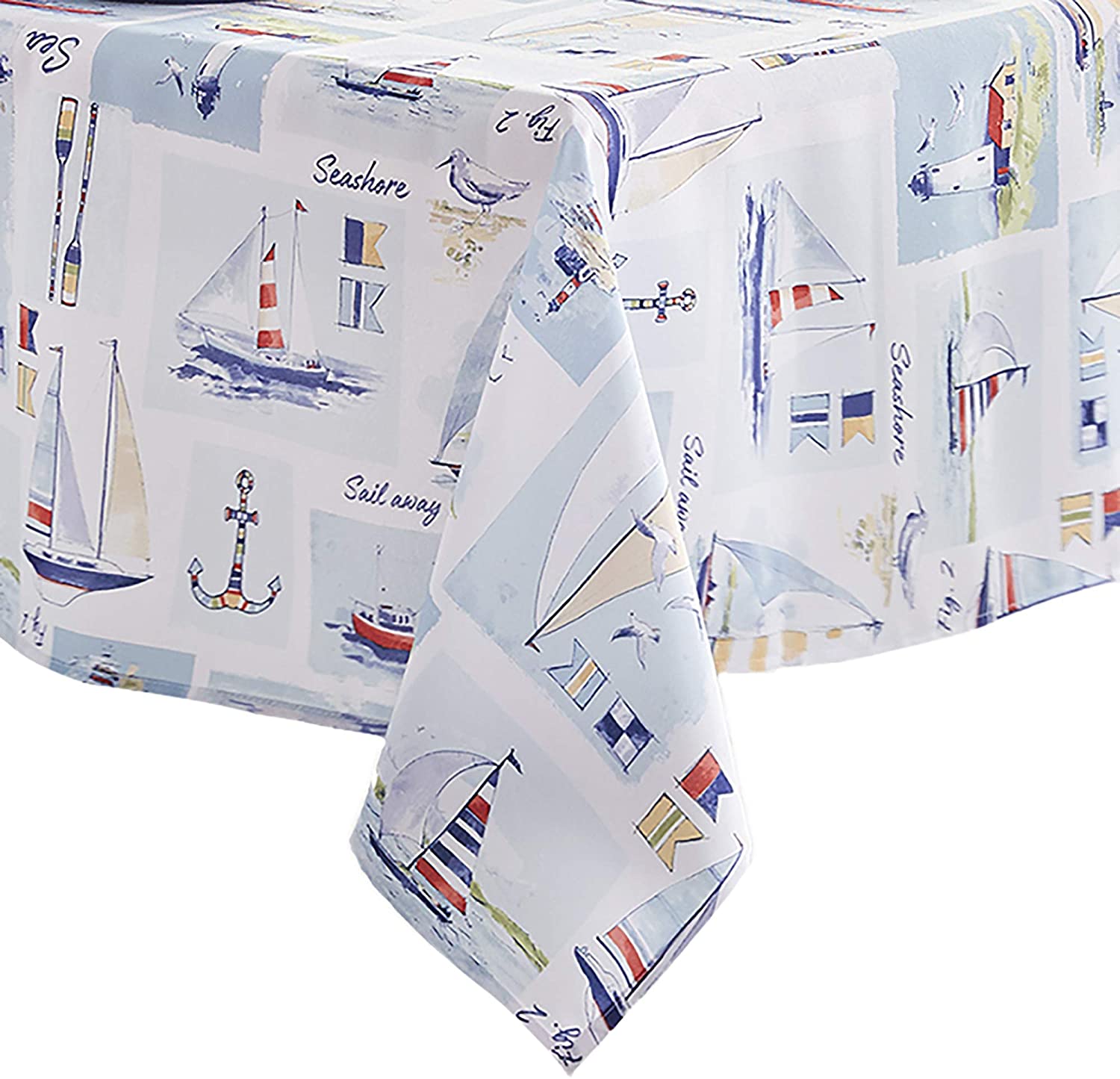 The Sail Away indoor outdoor tablecloth is the perfect solution to your decorating and table cover needs. Beautiful and scenic design features watercolor sailboats and other nautical accents, making it versatile, yet fashionable. Excellent for special occasions, events, parties, summer gatherings and everyday use this table cloth has the soft hand of an ordinary tablecloth, with the added function you need. Fabric is water and stain repellant, mold and mildew resistant, and fade resistant. Unlike some outdoor tablecloths, the fabric can be ironed to release stubborn creases and make your tablecloth wrinkle free. Hemmed edge adds a finished look and prevents wear and tear. Available in a large selection of table shapes and sizes, including a version with an umbrella hole and zipper to fit all your entertaining needs. 100% Polyester. Easy care, machine washable.