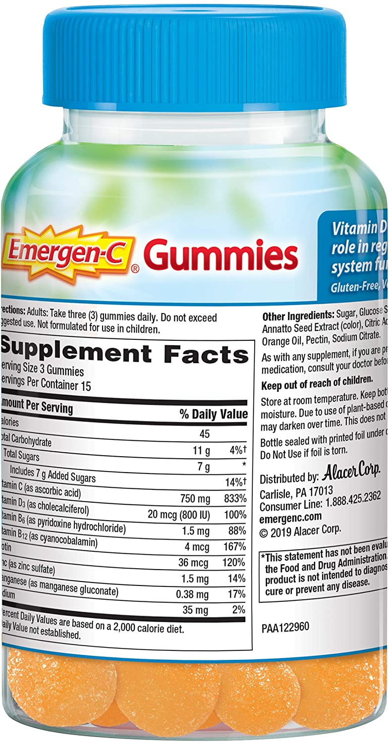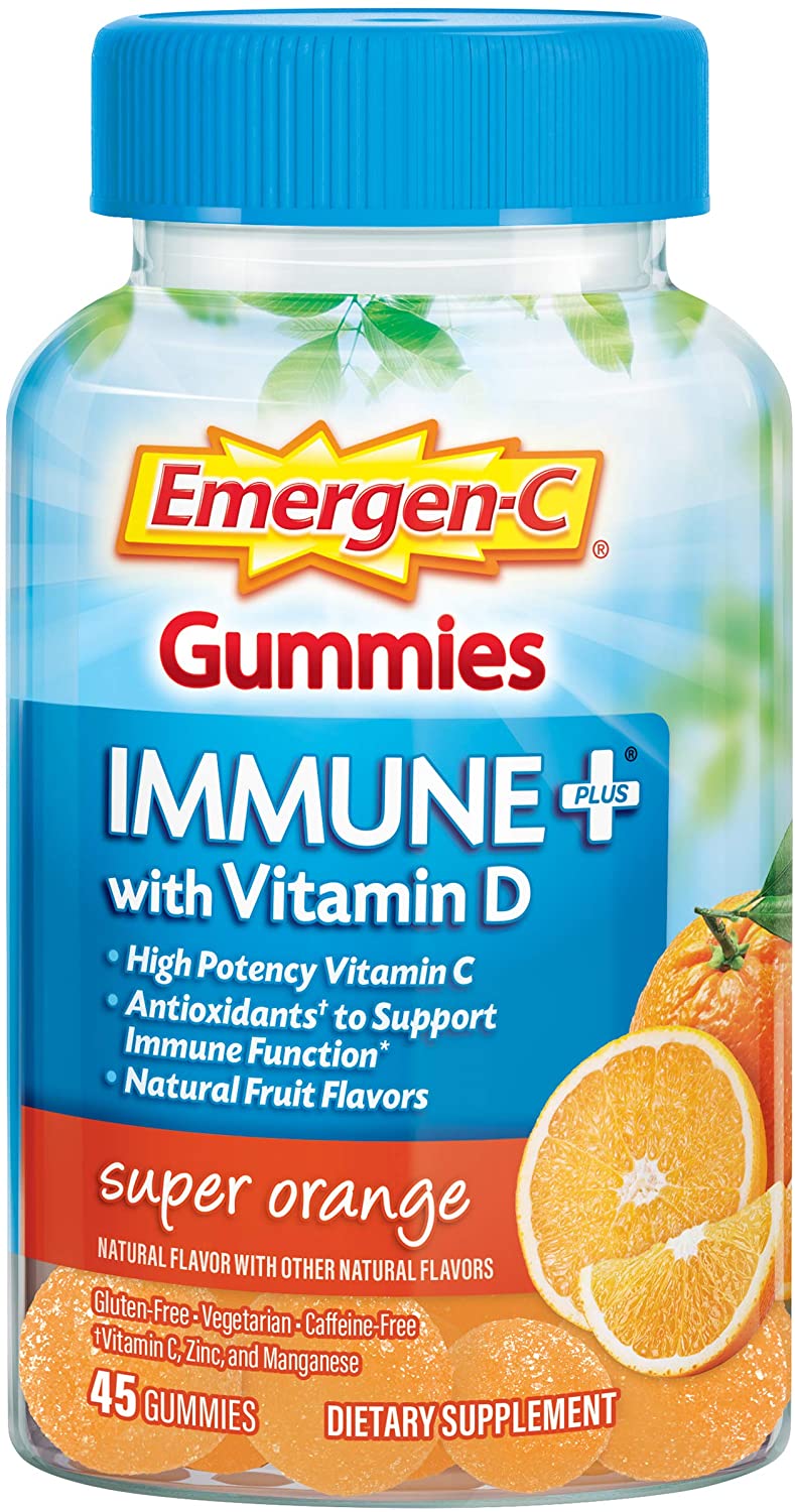 Emergen-C Immune+ Immune Gummies, Vitamin D plus 750 mg Vitamin C, Immune Support Dietary Supplement, Caffeine Free, Gluten Free, Super Orange Flavor - 45 Count