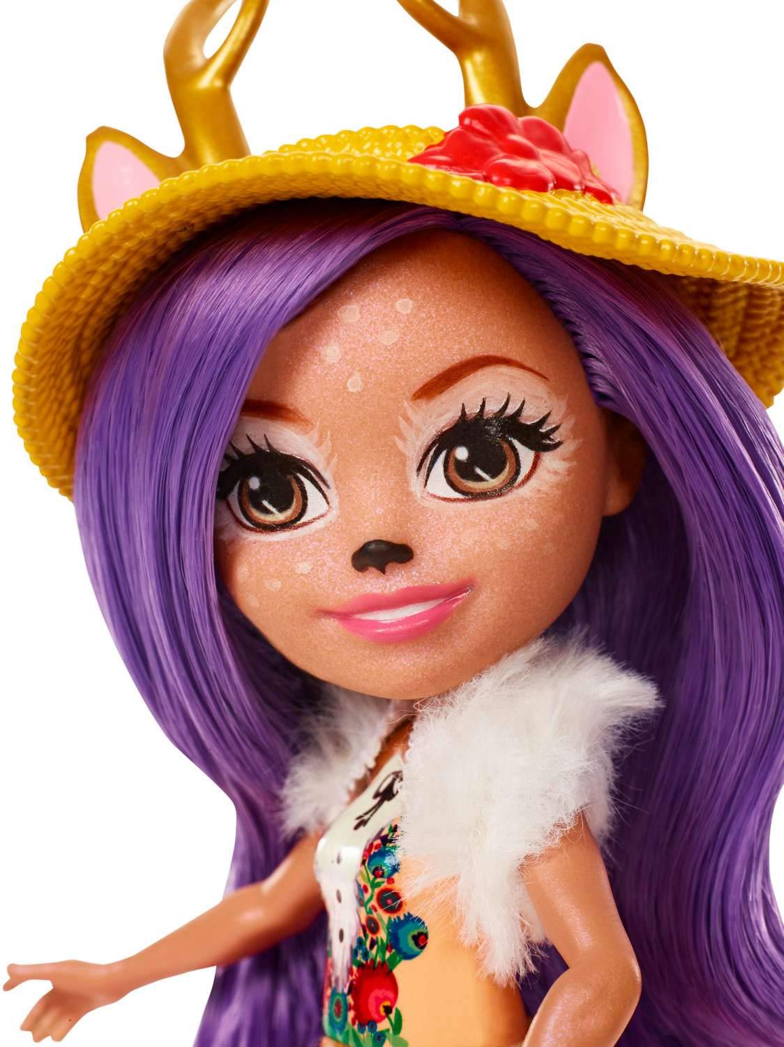 - Danessa Deer doll is a-doe-able in a red skirt with floral print, purple boots, a white furry stole and a sunhat that showcases her golden antlers and purple hair.