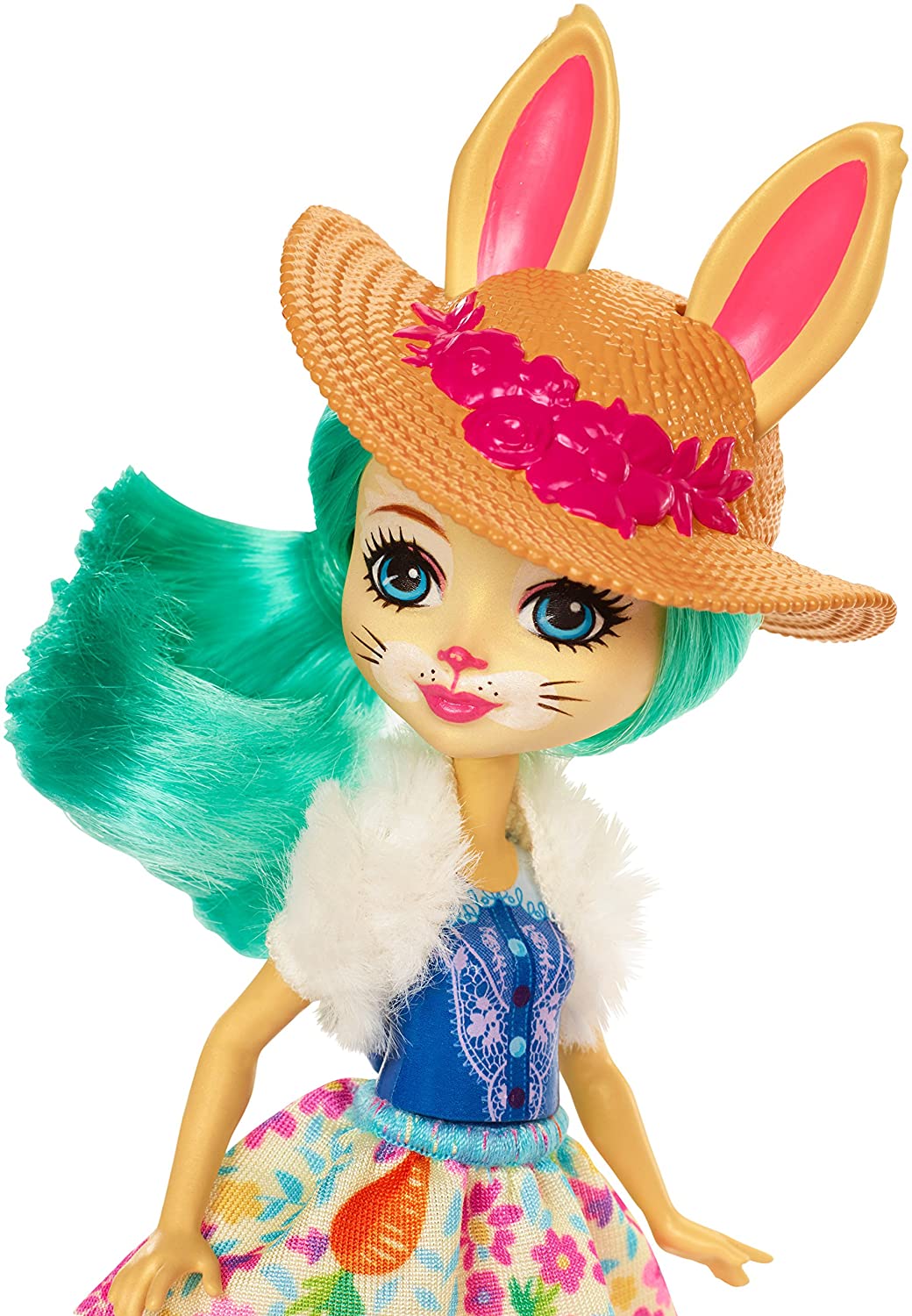 - Fluffy Bunny doll has bright teal hair and wears a white removable skirt with floral print. She accessorizes with pink shoes, a white furry stole and gardening hat that lets her rabbit ears poke through