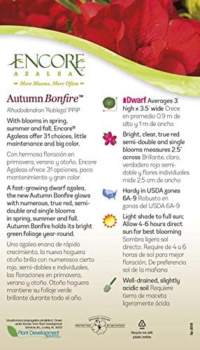 The 2017 addition to the Encore Azalea collection is the brand new Encore Azalea Autumn bonfire. This Encore Azalea brings the heat of rich blazing true red semi-double velvety blooms that stand out boldly against the dark green evergreen foliage & will enhance your landscape. In winter The Autumn bonfire? S foliage will change color to a deep purple green-bronze adding interest to your winter Garden. The compact size & tidy growth habit makes this very easy to care for & will require very little pruning. Pick a location in your landscape for This Azalea that will receive 4-6 hours of direct sunlight, then dig the hole twice as wide as the container your plant arrived in & mix in a well-drained slightly acidic garden soil. Fertilize your Encore Azaleas every Spring with a slow release acidic fertilizer to keep the blooms coming all season long!