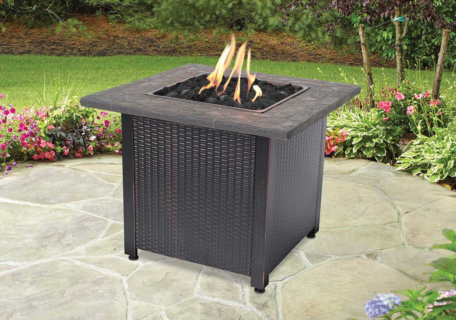 With its tile & steel mantel, this handcrafted Endless Summer LP gas fire pit features the classic elements of high end furniture, with the durability of weather resistant steel. Its decorative base cleverly conceals a propane tank (not included) & control panel, making it an attractive centerpiece for your outdoor living space. Complete with a 30,000 BTU stainless steel burner, you can enjoy all the ambiance of a classic fire without having to tend ashes. Adding to the elegance, this unit includes lava rock, which beautifully accents its flames. The unit is easy to assemble with no tools needed, & includes a 1-year limited warranty & protective cover.