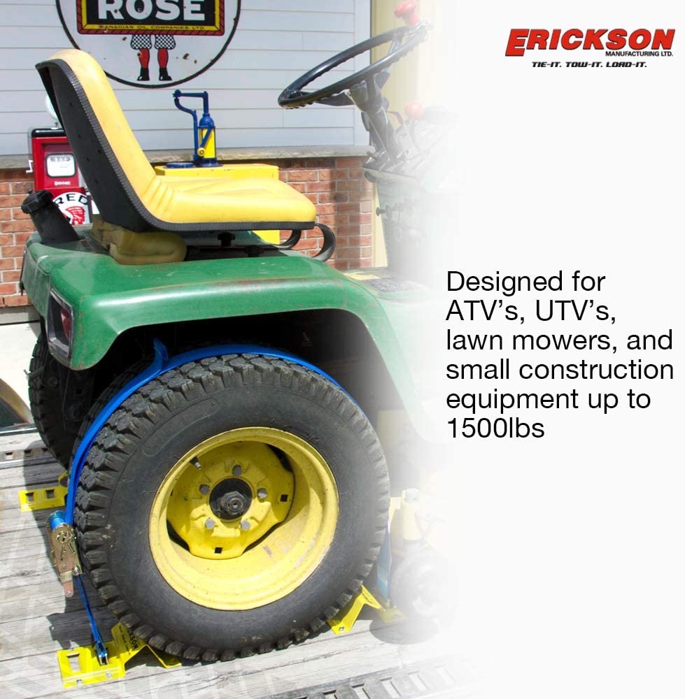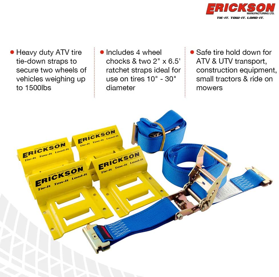 Erickson 09160 Wheel Chock Tie-Down Kit includes Two (2) E-Track Ratchet Straps and Four (4) Powder Coated E-Track Wheel Chocks. Designed for people that haul an ATV, mower or other off-road vehicle regularly. Wheel chocks are permanently mounted in place on your trailer deck or pickup bed. The brackets are intended to be placed behind both back wheels to hold the vehicle securely in place during transport. Simply drive over the brackets when loading and unloading. Rated for a vehicle with a maximum weight of 1500 lbs. (680kg). Strong webbed straps will work on tires as small as 10" and as large as 30" in diameter. Double slotted E-fitting allows for proper hook up on large and small tires. Mounting hardware is not included. As a leader of Tie-Down and Towing Products in North America, Erickson strives to provide the safest products available with the consumer in mind. Tie it. Tow it. Load it. Count on Erickson.