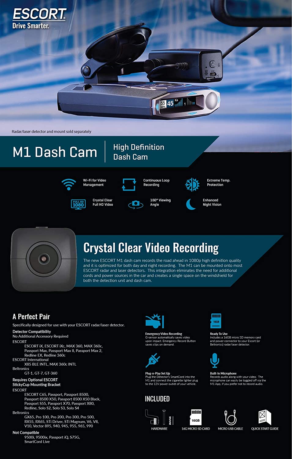 • VIDEO PROTECTION - The M1 integrates with your Escort Radar system by utilizing the same power source and mounts. With full HD 1080p resolution, collision detection, continuous loop technology, and the M1 app, you'll never miss a moment.