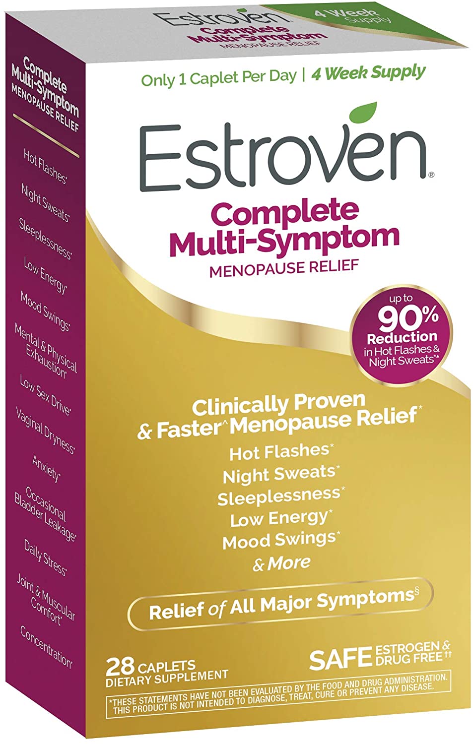 • SAFE AND EFFECTIVE: With an excellent safety profile, Estroven Complete Menopause Relief is drug-free, both estrogen and hormone free,*** soy-free, non-GMO, vegetarian, vegan, no MSG and gluten-free. Take one (1) small caplet daily. Results seen in as little as 28 Days. Does not contain any of the 8 major allergens