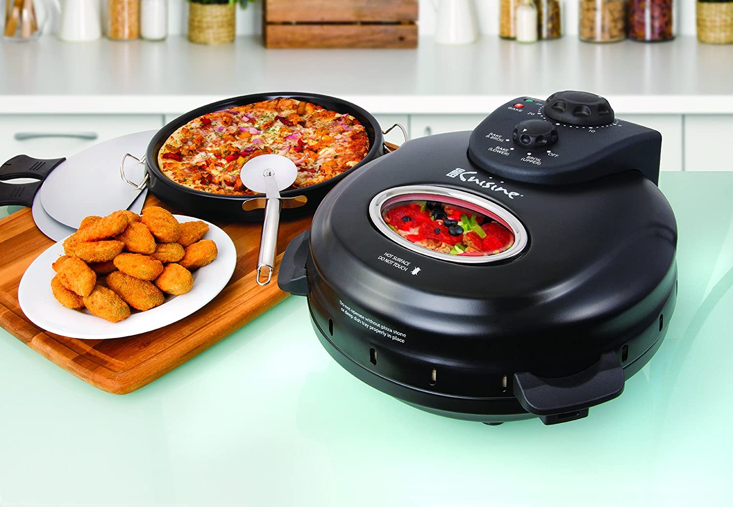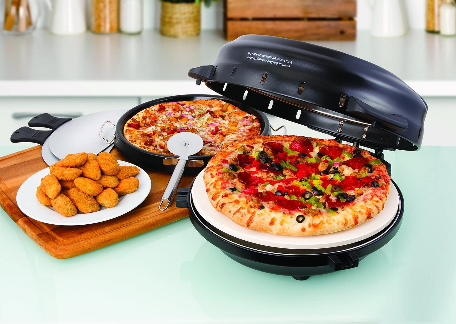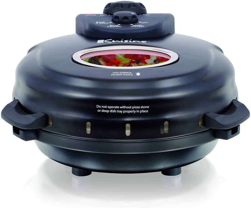 Enjoy delicious homemade pizza anytime with the Electric Pizza Oven by Euro Cuisine. The oven features 3 different heat settings and a 360-degree rotating cooking surface and includes a 12-inch pizza stone and a non-stick 12-inch deep dish pan for preparing a variety of evenly-cooked pizza every time. The efficient tabletop design saves energy over traditional ovens and the removable cooking surface makes clean up quick and easy. Also perfect for frozen or take-n-bake pizzas, potato skins, cinnamon rolls, biscuits, jalapeño poppers, chicken nuggets, fish sticks, fries, and more. Complete set includes pizza oven, 12-inch cooking stone, 12-inch deep dish pan, 2 pizza spatulas, and pizza cutter.
