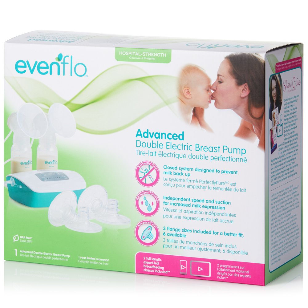 This innovative pump's PerfectlyPure closed system design helps keep your tubing clean and dry by preventing milk from spraying or back flowing into the tubing or motor. This helps protect mom's breast milk from potential growth of bacteria, viruses and mold. Each pumping session can be personalized with the AdvancedControl multi-phase technology, which provides independent speed and suction controls to maximize milk expression by promoting multiple let downs (or milk releases). The Advanced Double Electric Pump includes multiple, velvety soft silicone flange sizes to give you a custom fit for maximum milk expression and comfort. Also included is a battery power option so you don't miss a pumping session when you are away from an outlet. Plus, this breast pump works with the Evenflo Advanced Milk Storage Bag Adapters, allowing you to store milk faster and reduce milk loss when transferring from collection bottle to storage bag.