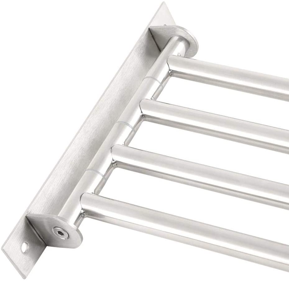 This modern design stainless steel drying rack has 4 bars which swivel right and left 90-degree. This allows the bars to be stored flat against the wall when not being used or to adjust bars for optimal drying of garments. The stainless steel construction will not rust or tarnish. Clean modern design is an attractive and useful addition to your laundry room utility room or bathroom.