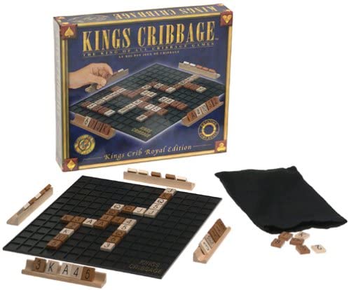 Welcome to Kings Cribbage, an unusually effective blending of the age- old pasteboards-and-pegboard card game, with the crossword grid strategy of Scrabble. Players take turns building crib hands of two to five hardwood tiles, each bearing playing card rank--deuce through ace. As in Scrabble, players are allowed to add tiles from their rack to the ends of, or perpendicular to, existing plays on the rotating board. The scoring is virtually identical to cribbage--runs, pairs, 15s--with bonus points awarded to any player who can fashion a crib hand with tiles all the same color. With its deluxe, two-toned hardwood equipment (though the board is fashioned from less-than-regal plastic) and illustrated English/French rules, Kings Cribbage is a crowning achievement in challenging play.--Tony Mason