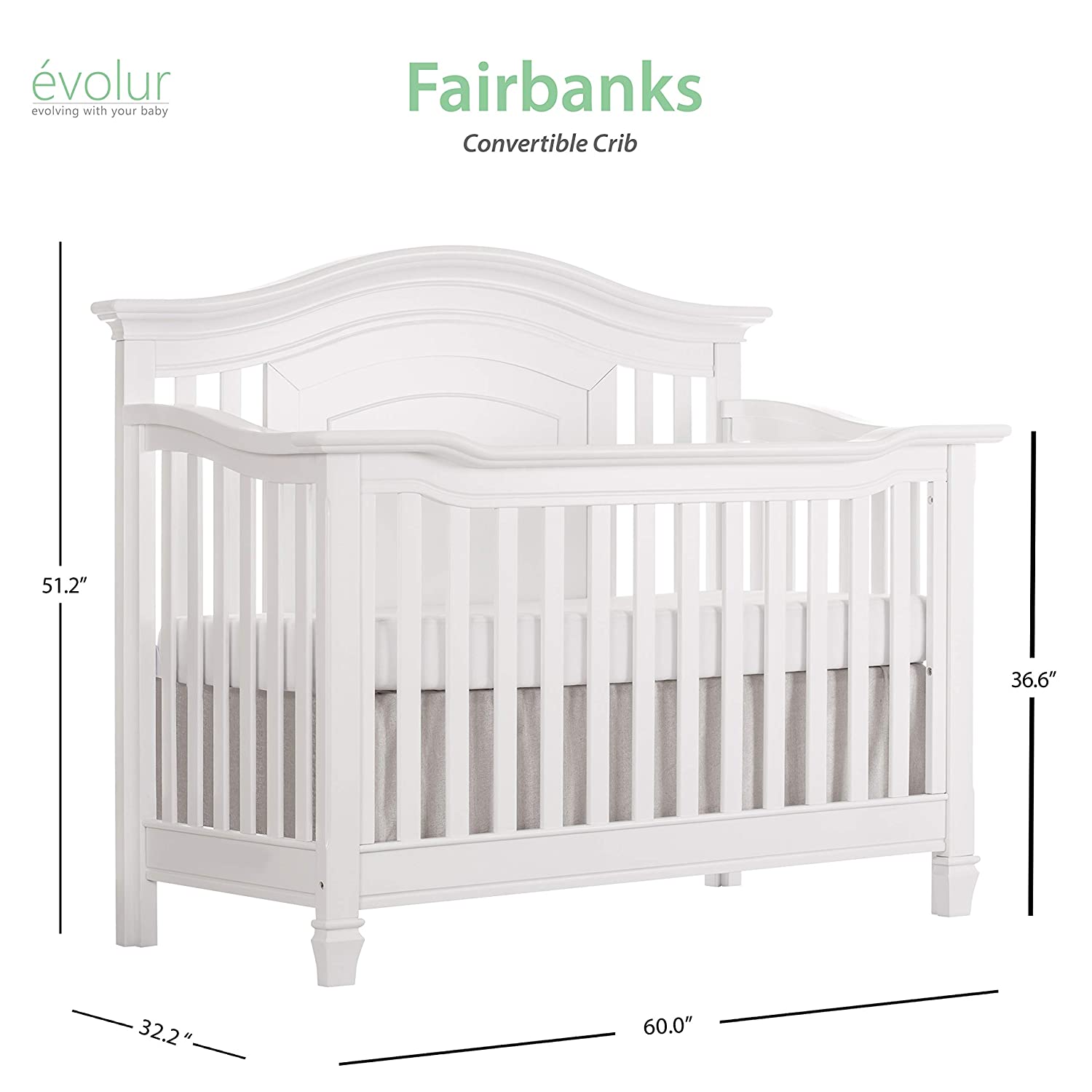 The Fairbanks 5-in-1 Convertible Crib is a timeless classic! Featuring an architecture-inspired design and gender-neutral form, the pièce-de-résistance of the Fairbanks crib is, however, its solid ¾ panel headboard. Add to this a scooped footboard that provides easy access to your baby. Constructed out of kiln-dried hardwood with hardwood veneers, the Fairbanks is built to last and is truly a lifetime investment. We believe in creating furniture that evolves with your growing child. The Fairbanks 5-in-1 Convertible Crib does exactly that. The Fairbanks features 3 mattress height settings that can be adjusted depending on your child. Set it at its highest setting during the newborn months and lower it as your child starts to pull up and stand. It converts to a toddler bed with our conversion kit (sold separately) and daybed. Add our wooden bed frame (sold separately) to convert it into a full-size bed. The Fairbanks is available in two sophisticated finishes - Ash Gray and Winter White, that is perfect for a boy or girl nursery. At Evolur, safety is always our No.1 priority - Our cribs are built to the highest safety standards that meet/exceed those set by the CPSC, JPMA, and ASTM. Each of our cribs undergoes rigorous testing by independent laboratories for compliance with all US and Canadian crib regulations. Pick coordinating pieces from our Evolur Fairbanks Collection like the Double Dresser and Tall Chest to create a timeless nursery. Crib dimensions are 59.75″ L x 29.75″ W x 51.50″ H and the crib weighs 81.5 lbs. For the best mattress fit, we recommend any Dream on Me or Evolur standard, full-size, non-toxic, Greenguard certified crib mattress (sold separately).
