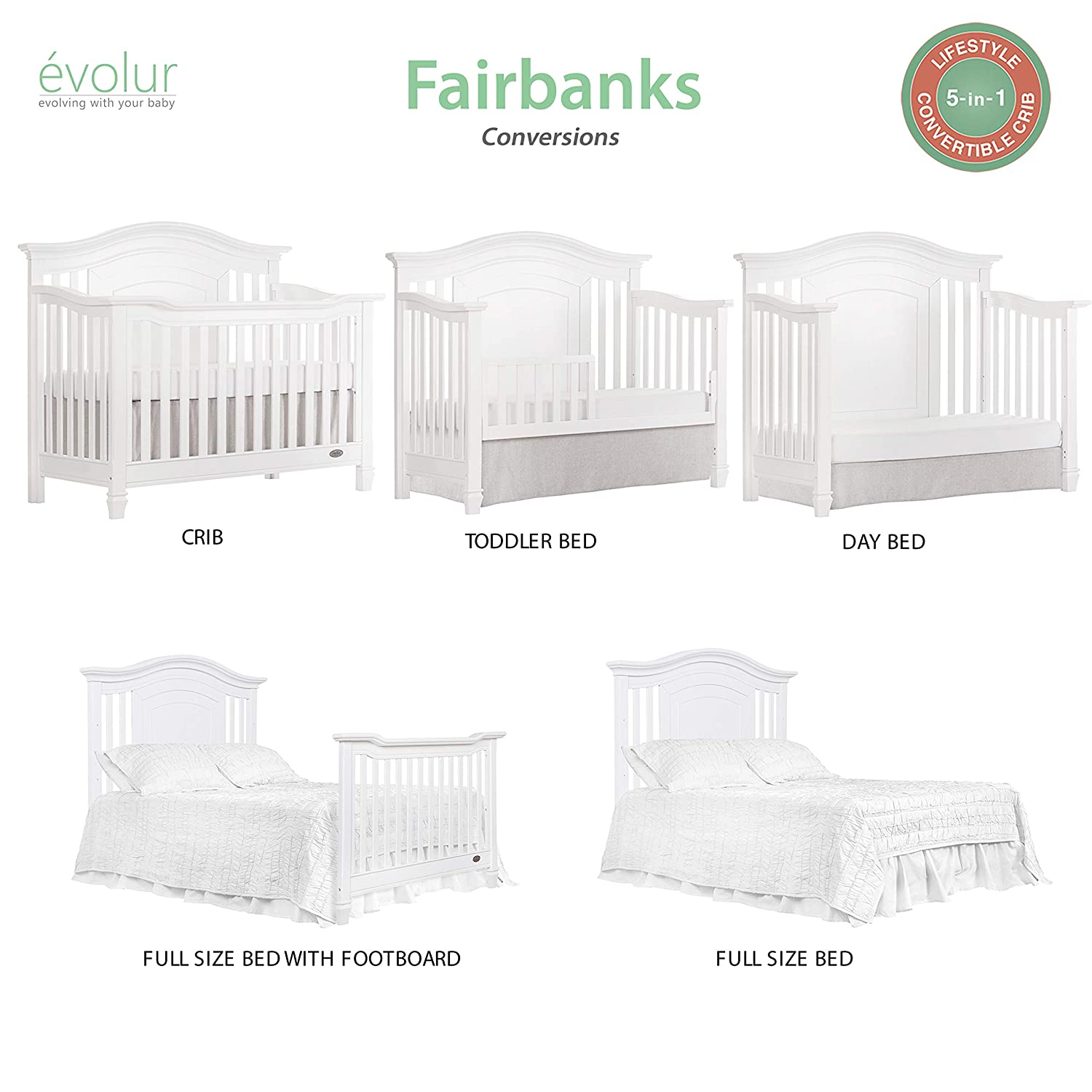 • 5-in-1 CONVERTIBILITY - The Fairbanks converts to a toddler bed with our conversion kit (sold separately) and daybed. Add our wooden bed frame (sold separately) to convert it into a full-size bed. It also features 3 mattress height settings.