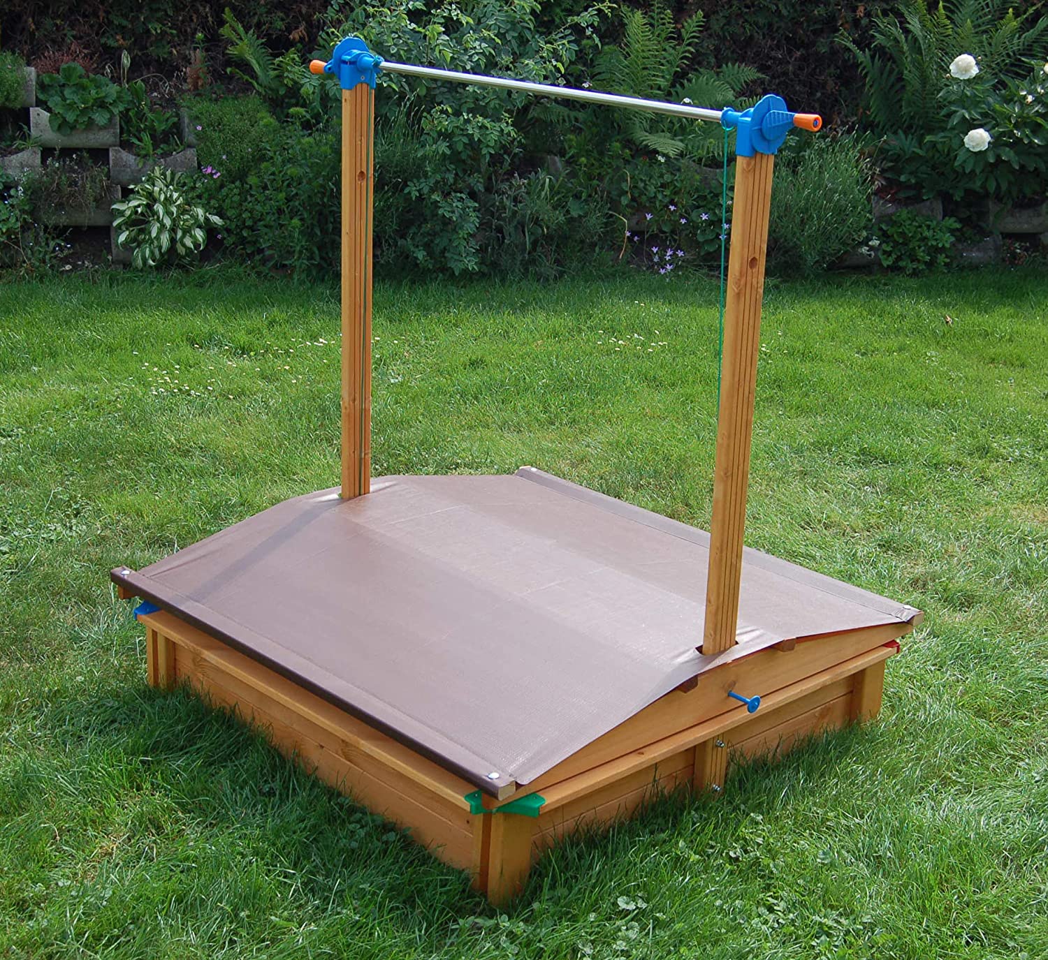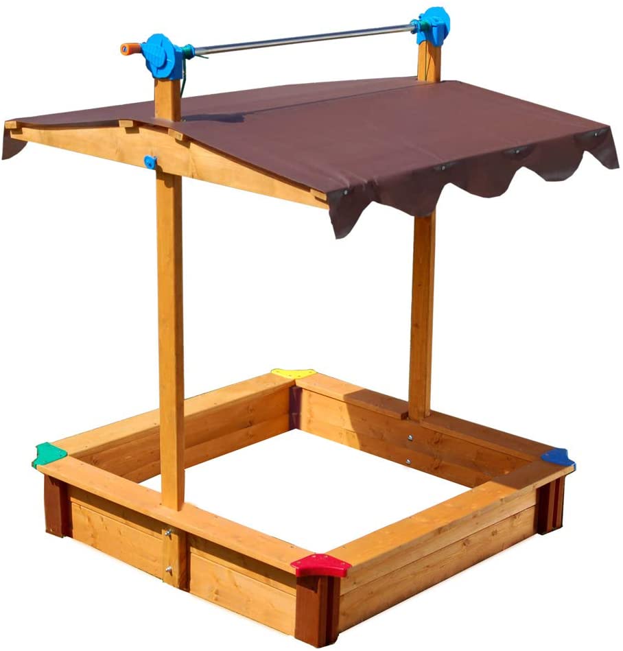Roof provides shade while the children play and lowers to keep out animals and rain done. From GASPO in Austria - Made from PEFC certified spruce/pine wood treated with water based child-safe stain - UV 50+ stabilized roof. Sandbox: T.U.V. & Bureau Veritas approved. (no floor for hygiene reasons) 40" x 40" x 51" H