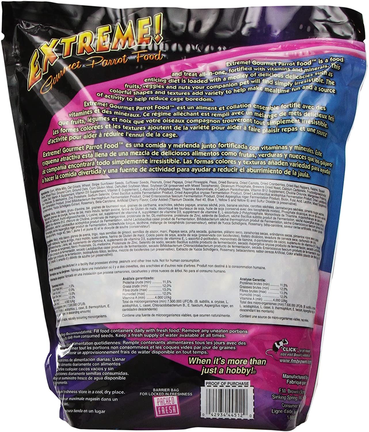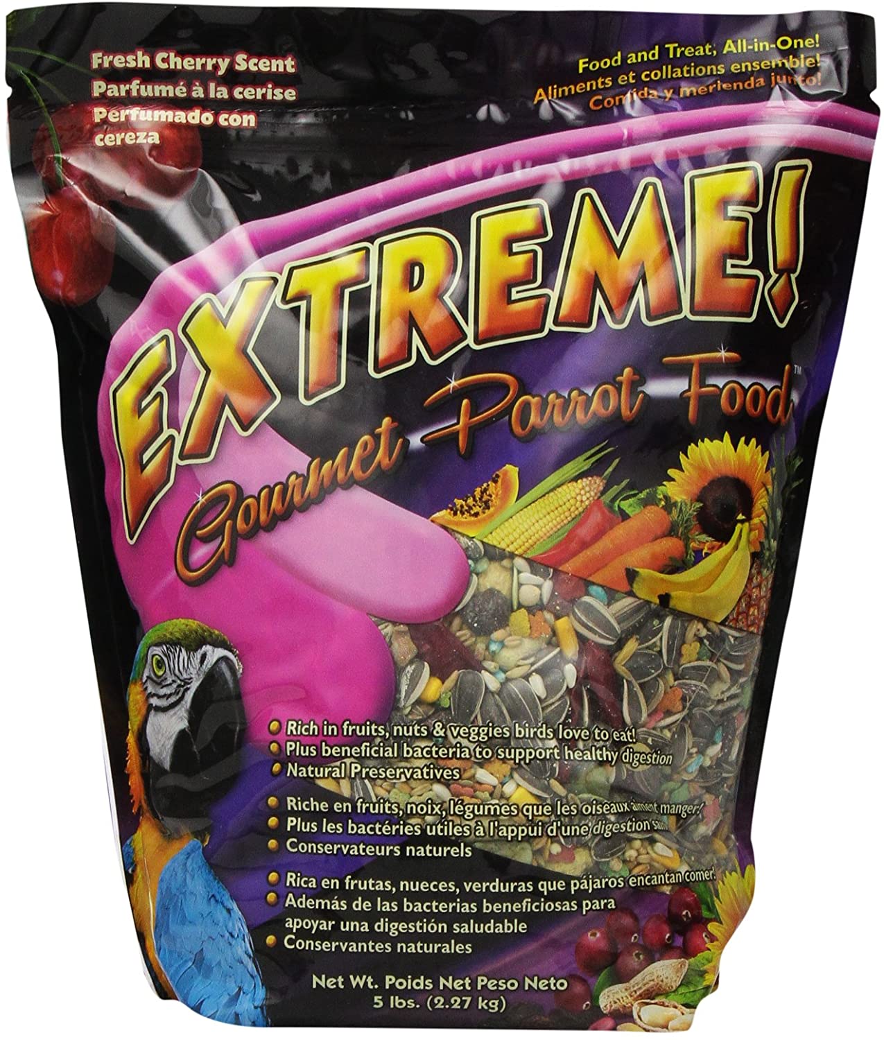 Extreme! Gourmet Parrot Food is a food and treat, all-in-one, fortified with vitamins and minerals. This enticing daily diet is loaded with a medley of delicacies such as fruits, veggies, and nuts your companion pet will find simply irresistible. The colorful shapes and textures add variety to help make mealtime fun and a source of activity to help reduce cage boredom.