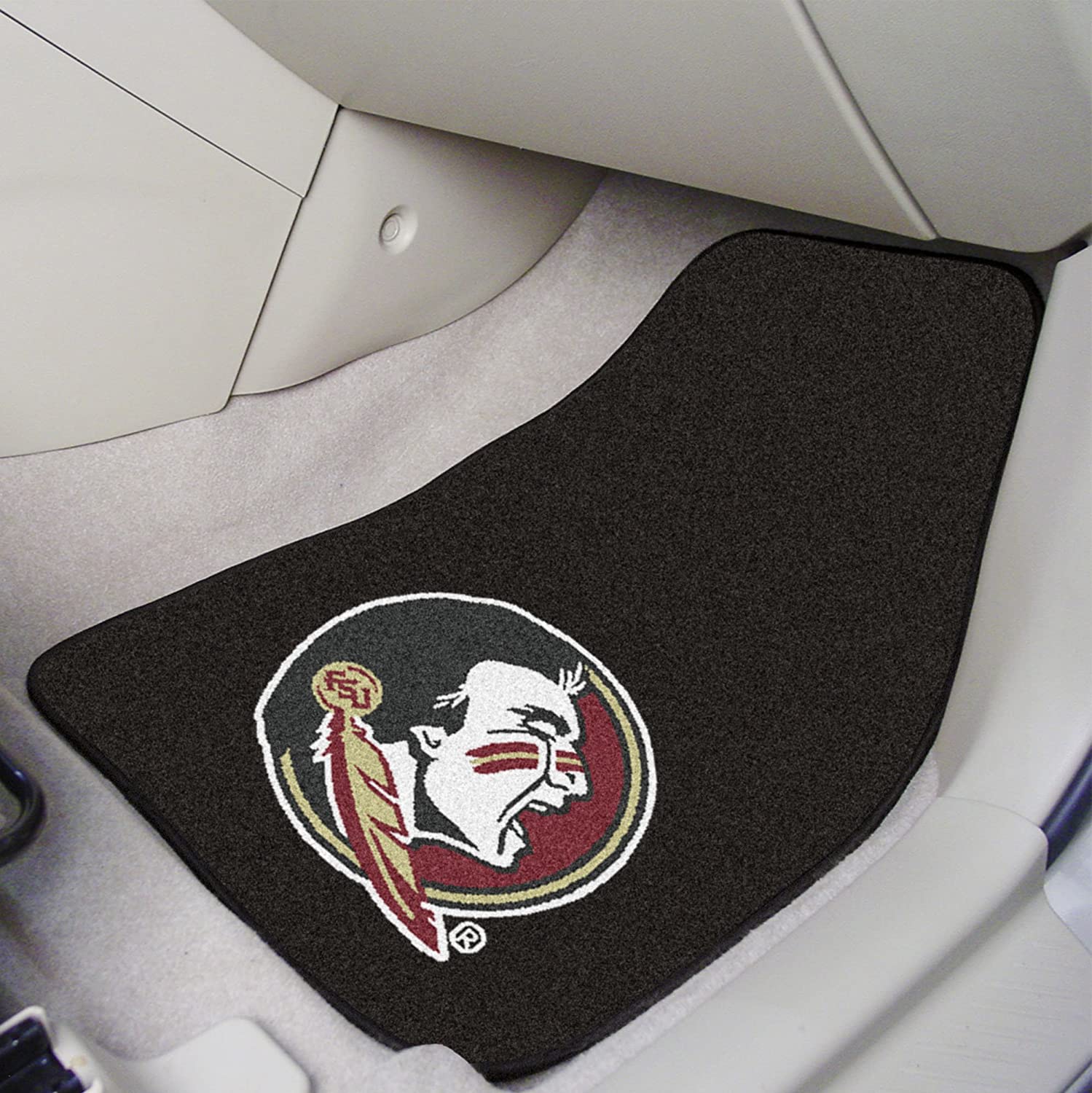 FANMATS Florida State University Carpeted Car Mats Set - 2 Pieces protects your vehicle's flooring while showing your team pride. Carpeted car mats by FANMATS are crafted with a 100 percent nylon face with non-skid vinyl backing. The universal fit makes it ideal for cars, trucks, SUVs, and RVs. These officially licensed mats are chromojet printed in true team colors and designed with a large team logo. Made in USA.