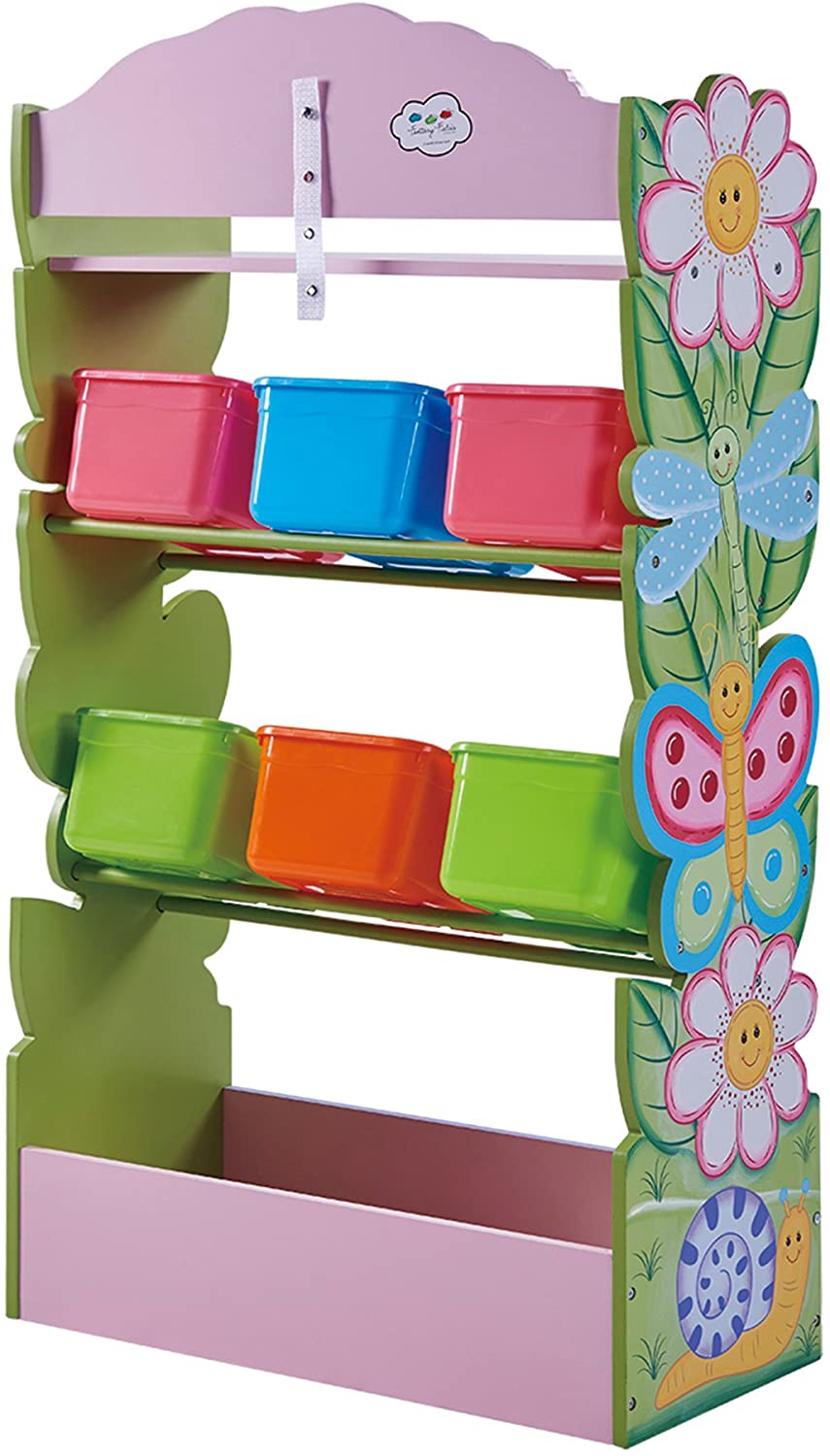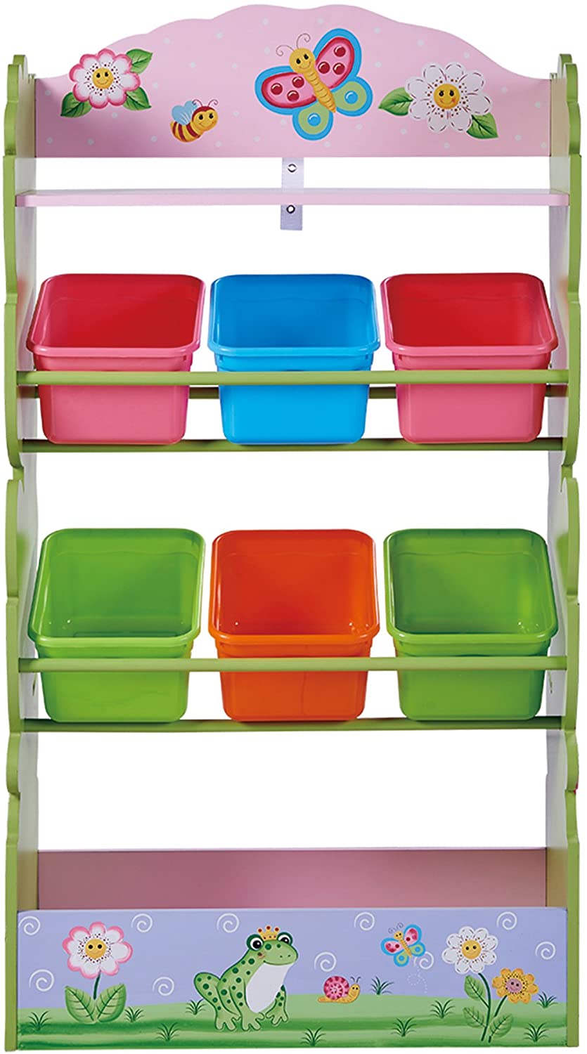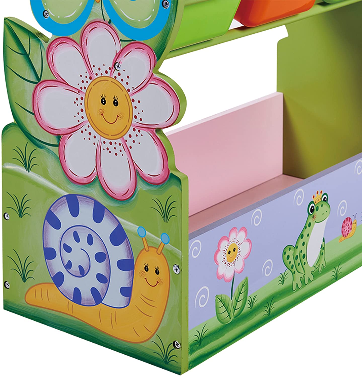Brighten your child's play area while keeping it organized and clutter-free with the Fantasy Fields Magic Garden Kids Wooden Toy Organizer with Storage Bins. This multicolor shelving system comes decorated with a magical forest display featuring flowers and friendly forest creatures for a whimsical playroom storage solution. The 6 included storage bins come in and out of the rack easily and contain ample space for your little one's toys, craft supplies, clothes, and more, while the shelf above and compartment below provide additional storage options for versatile organization. Purchase this organizer on its own or with other items from the Magic Garden collection for a bright and joyful playroom. For quick and easy assembly, step-by-step instructions are included. Constructed of sturdy wood, this organizer is designed for long-lasting use. For convenient upkeep, the storage system's easy-to-clean surfaces make wiping up any spills a breeze. The Fantasy Fields Magic Garden Kids Wooden Toy Organizer with Storage Bins measures 23.75" x 11" x 44.25" and is designed for children ages 3 years and up. For over 20 years, Teamson Kids has been manufacturing products of the highest quality along with the best craftsmanship. We take pride in our expertly crafted high quality children's wooden furniture designs and strive to exceed all safety standards. We create beautiful pieces that encourage your child's imagination while seamlessly fitting into your home.