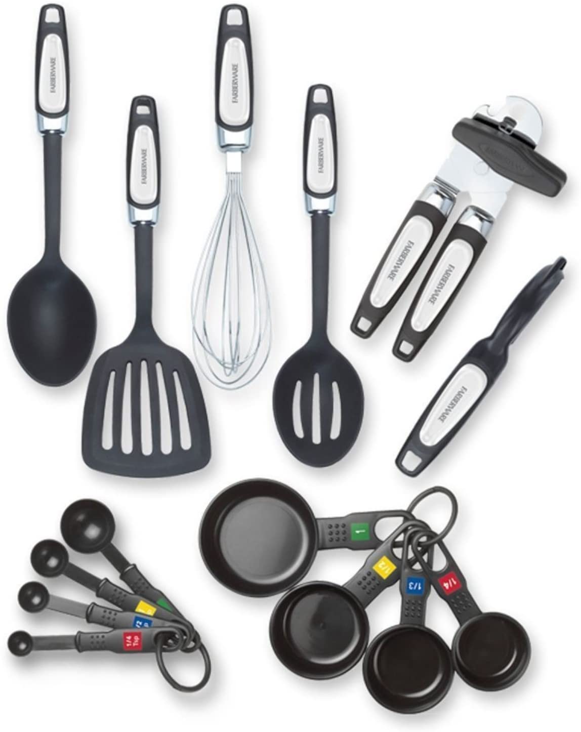 This Farberware Boxed Tool and Gadget Set contains all you need for kitchen prep work. The dishwasher-safe utensils won't scratch cookware and the handles feature a durable, nonslip comfort grip. Set includes 1 each of: slotted turner, basting spoon, slotted spoon, can opener, whisk, euro peeler, set of 4 measuring cups, and set of 4 measuring spoons.