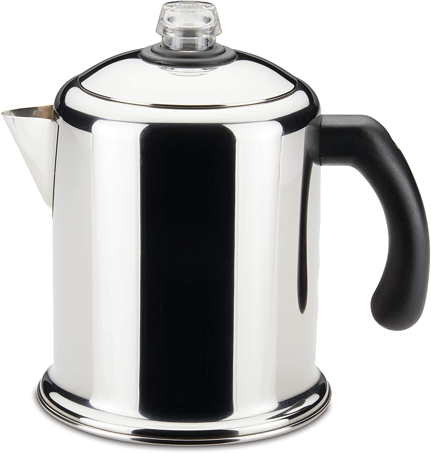 - Durable and convenient: Heavy-duty stainless steel coffee maker is polished to a mirror finish. The sturdy, clear glass knob lets you know when percolating begins