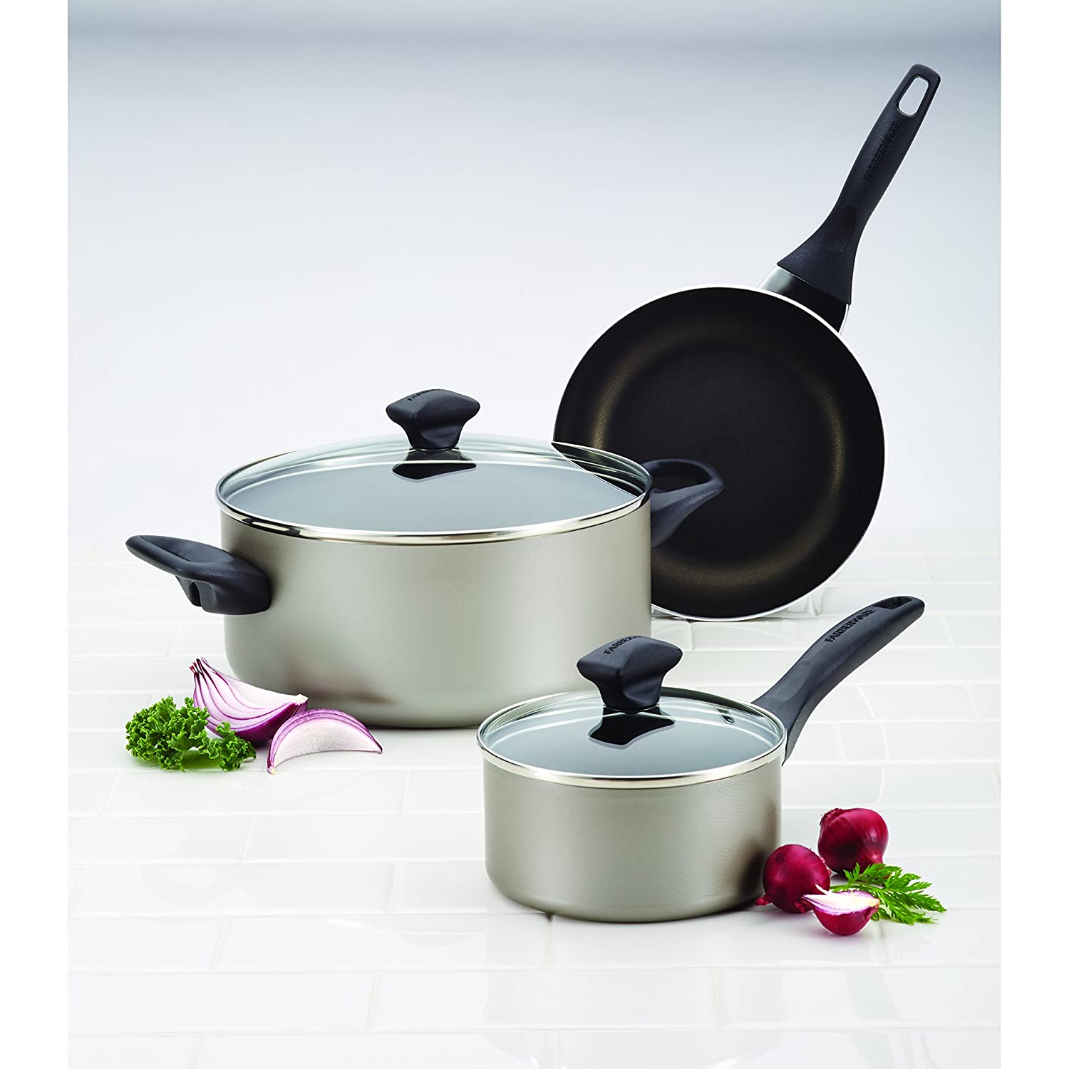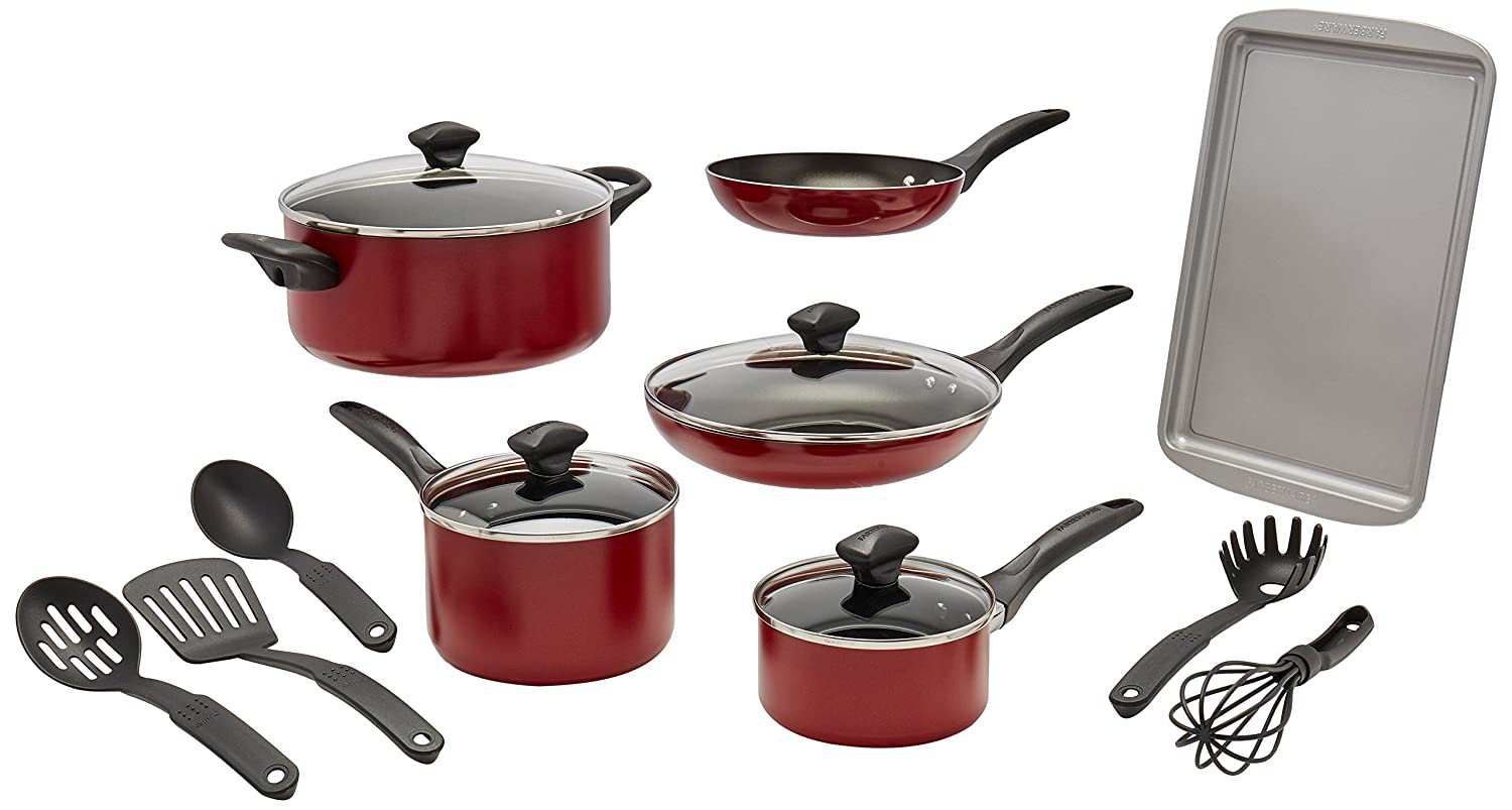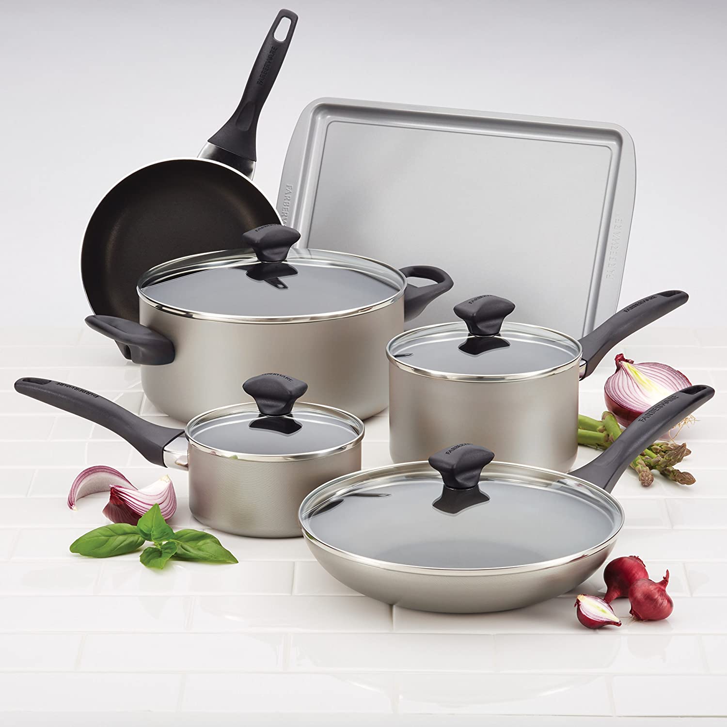 Top-quality nonstick interiors release foods easily for fast cleanup; cookware is dishwasher safe for even more convenience