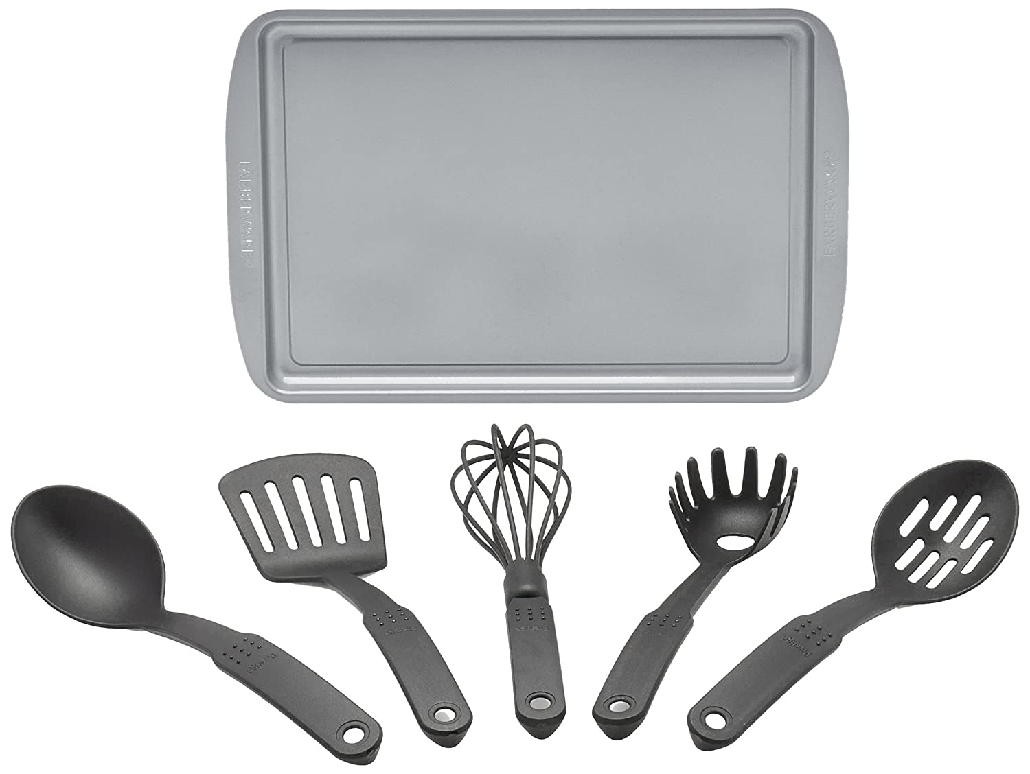 Cookware is oven safe to 350 degrees Fahrenheit, bakeware to 450 degrees Fahrenheit; five handy nylon Prestige(r) kitchen tools included (not oven safe)