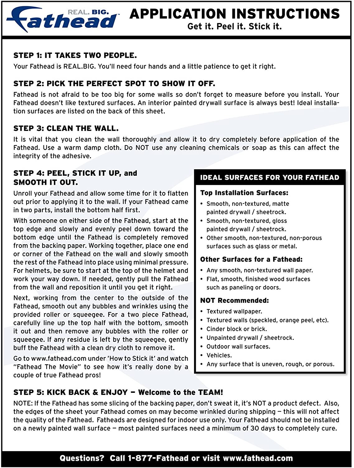 The Fathead wall graphic is made from tough, tear and fade-resistant vinyl and features high-resolution 3D graphics. Fathead wall graphics use a low-tack adhesive and can be moved and removed from walls without damaging surfaces.
