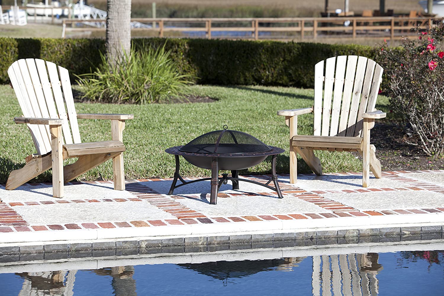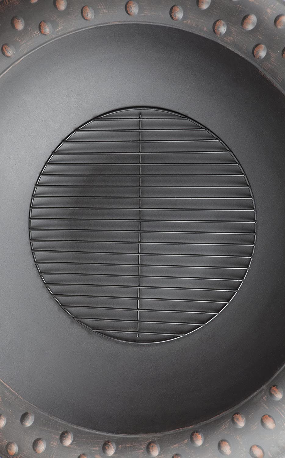 This unique fire pit features a 35" high temp antique bronze painted steel fire bowl with hammered lip, and brushed painted steel legs. This fire pit comes complete with mesh fire screen with high heat paint and a wood grate. Also included is a screen lift tool.