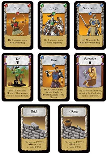 In Castle Panic players must work together to defend their castle, in the center of the board, from monsters that attack out of the forest, at the edges of the board. Players trade cards, hit and slay monsters, and plan strategies together to keep their castle towers intact. The players either win or lose together, but only the player with the most victory points is declared the Master Slayer.