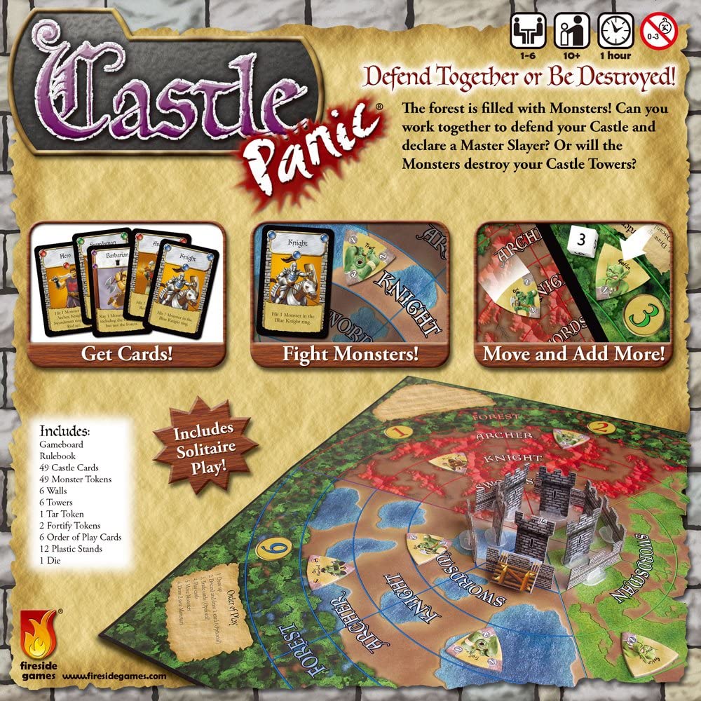 Castle Panic is a cooperative tower defense board game for 1 to 6 players, ages 10 and up. The co op element makes Castle Panic a great family game and the perfect kick off for your weekly game night. You must work together to defend your Castle, in the center of the board, from Monsters that attack out of the forest, at the edges of the board. Trade cards, hit and slay Monsters, and plan strategies together to keep your Castle towers intact. The players either win or lose together, but only the player with the most victory points is declared the Master Slayer. Players must balance the survival of the group with their own desire to win.