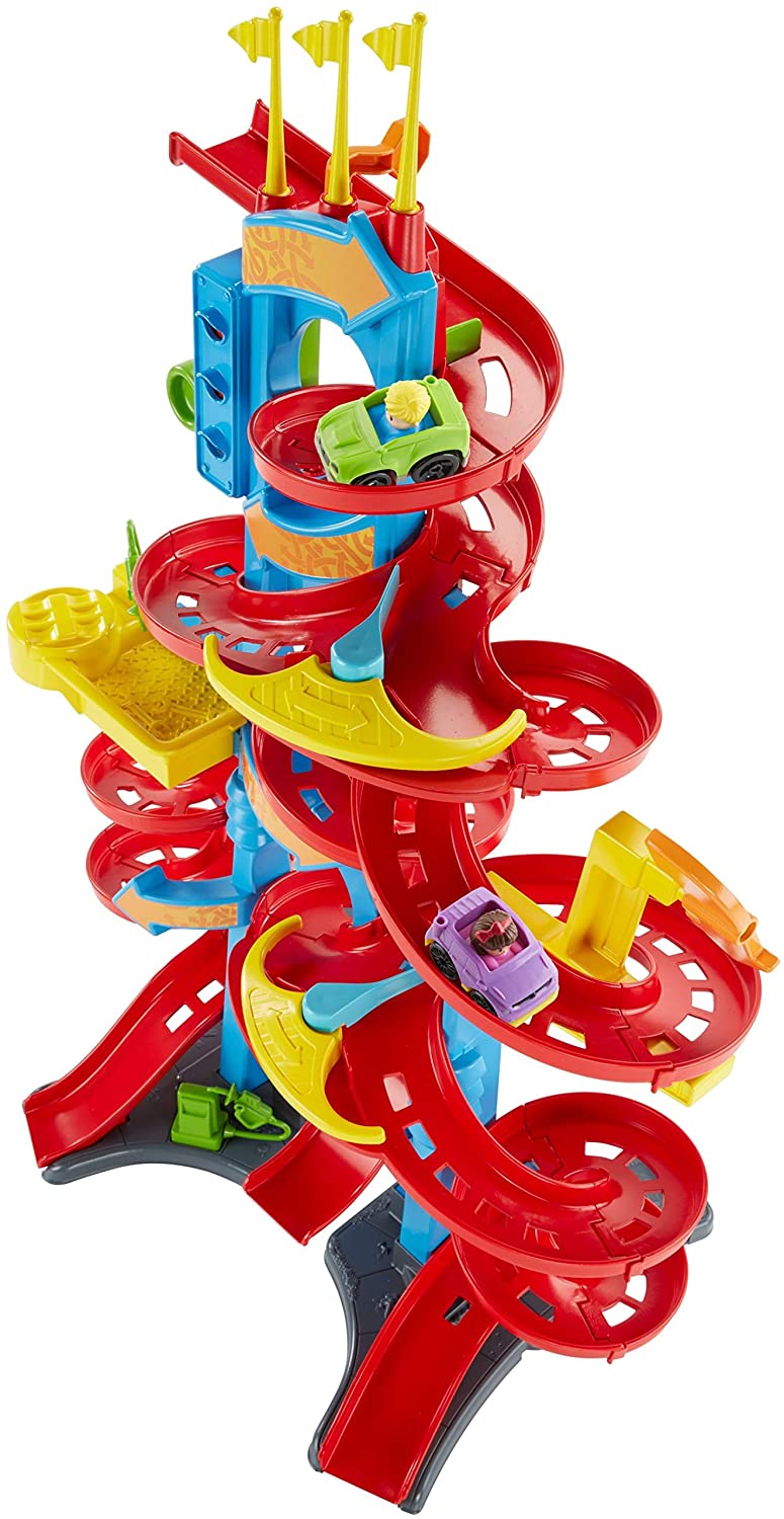 At over 3 feet tall, the Little People Take Turns Skyway is the tallest Wheelies racetrack ever! With three different tracks, an awesome launcher, cool racing sounds and phrases, and pretend play stops along the way, this track set is loaded with awesome racing fun for toddlers to discover and share. Little things that make a big difference Taking Turns: As kids share the tracks, sending vehicles zooming down and around, they see that taking turns means more fun for everyone! Imaginative Play: With easy-to-grasp vehicles and pretend play stops like a gas & repair station, toddlers can use their imaginations to create stories as they play. Fine Motor: Little hands get a big workout as they grasp the vehicles and send them zooming down the tracks.