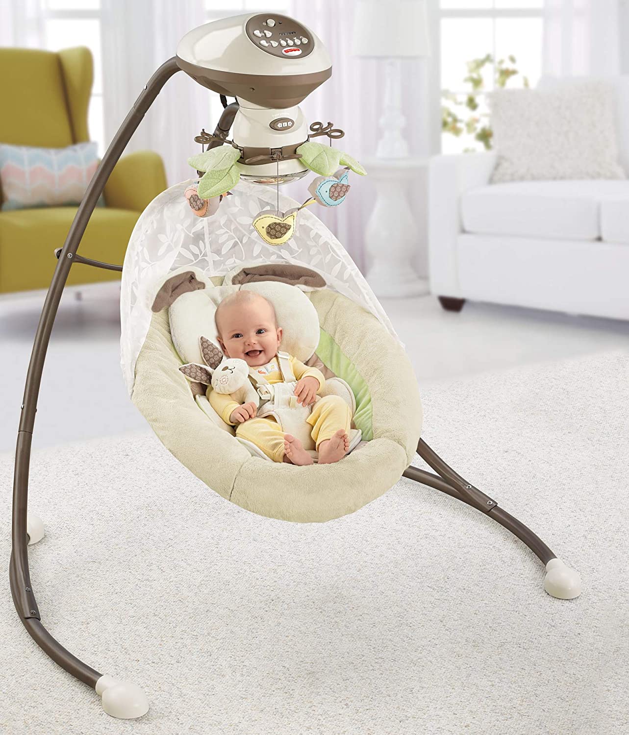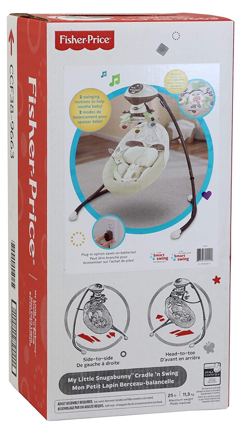What a plush place for your little bunny to snuggle into; The Fisher-Price My Little Snugabunny Cradle ‘n Swing offers a comfortable, relaxing environment to help comfort and soothe your baby; With two swinging motions (side-to-side and head-to-toe), 6 swing speeds, and a variety of other customizable features, you can choose the calming combination that works best for your baby; This infant swing also features a soft head rest, airy canopy, and an overhead motorized mobile with mirrored globe and bird friends; Max weight 25 lb/ 11,3 kg; Use from birth until child attempts to climb out of product